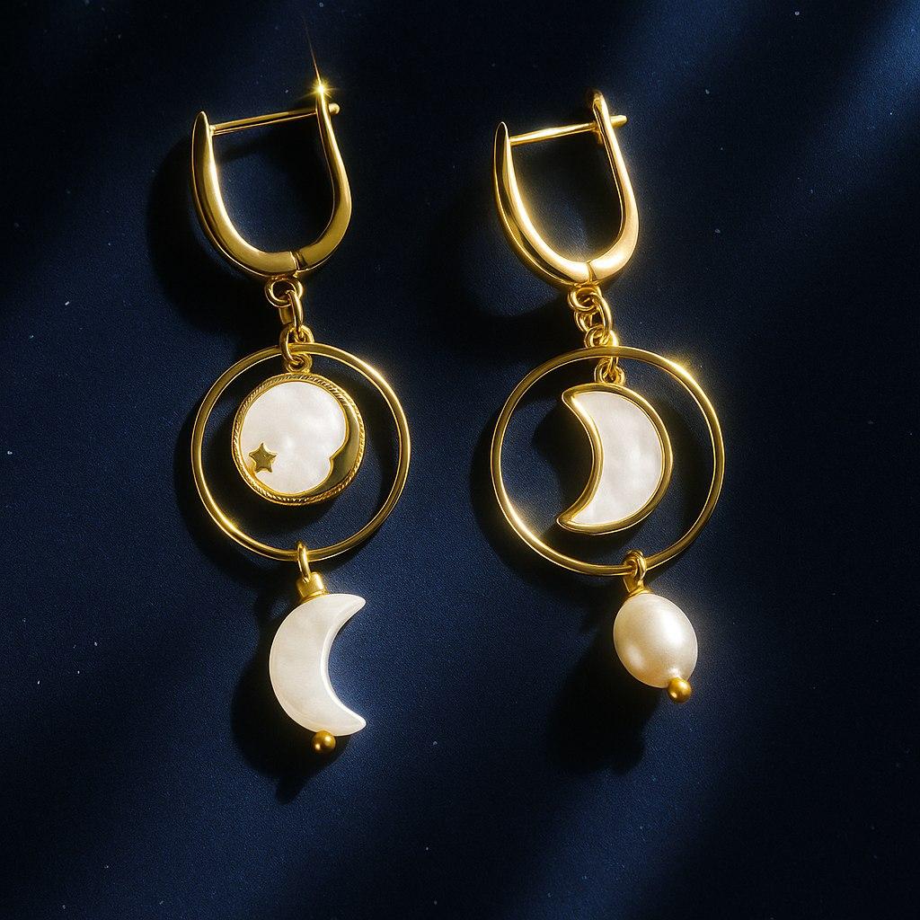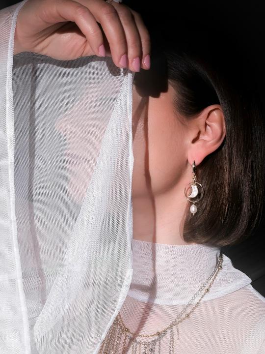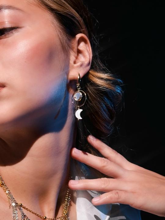 Эти серьги ассоциируются с различными фазами луны, каждая из которых символизирует этап жизненного пути, и напоминает о том, что перемены — это его неотъемлемая часть. Материалы: перламутр, натуральный культивированный жемчуг. Фурнитура из латуни покрыта золотом/родием. Длина: 5,5см.