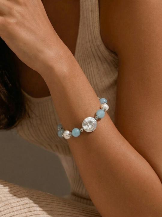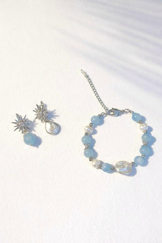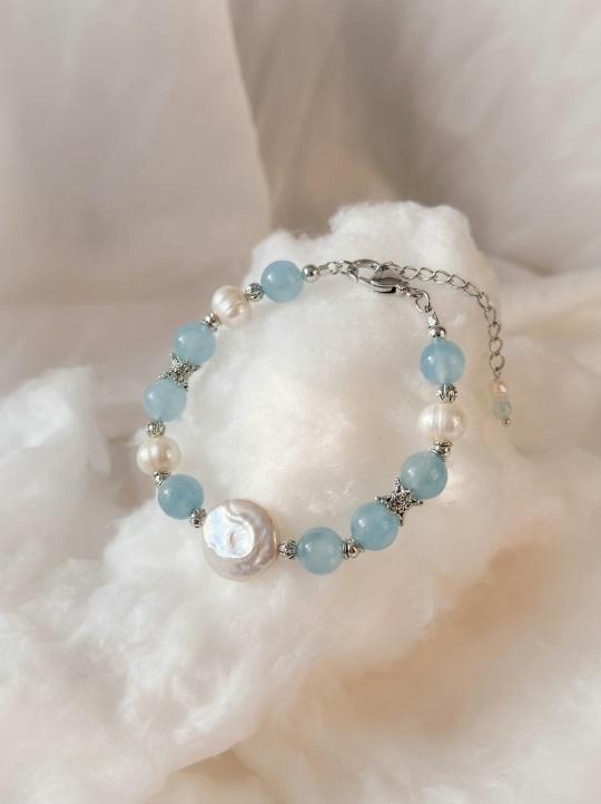 Этот браслет соединяет нежный аквамарин и элегантный жемчуг в единую композицию. Он словно отражает безмятежность голубого неба, символизируя спокойствие и красоту. Такой браслет станет прекрасным дополнением любого образа, добавляя ему свежести и легкости. Материалы: натуральный аквамарин, натуральный культивированный жемчуг. Фурнитура из латуни покрыта родием. Длина: 17,5см + удлинитель 5см.