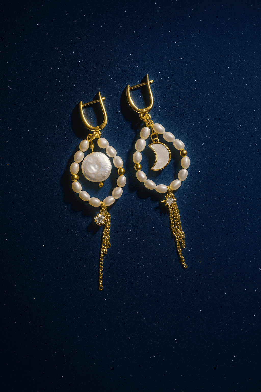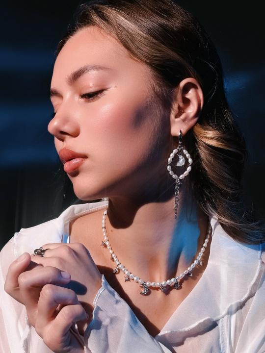 Эти серьги вдохновляют на смелые мечты и стремления. Они дарят ощущение свободы и легкости, как полет в облаках под ночным сияющим небом. Материалы: натуральный культивированный жемчуг, перламутр, фианиты. Фурнитура из латуни покрыта золотом/родием. Длина с цепочками: 8см.