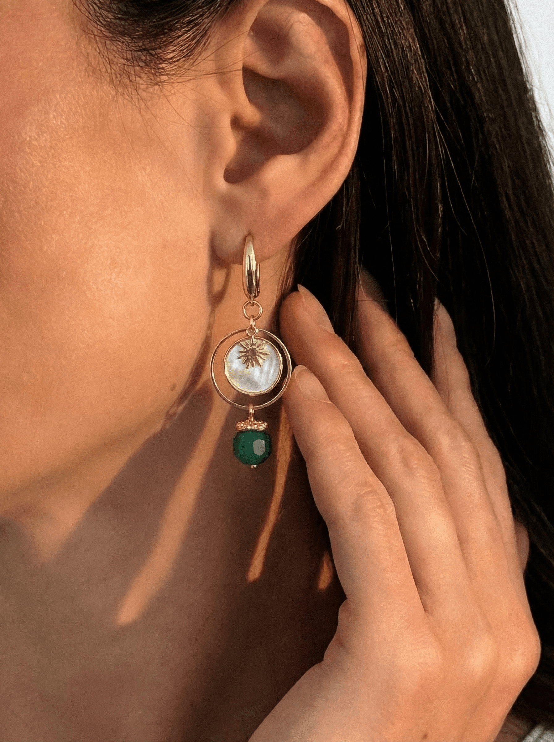 Серьги с жемчугом и зеленым агатом воплощают чистоту весеннего воздуха, наполненного ароматами пробуждающейся природы. Их форма и цвет создают ощущение легкости и свободы. Материалы: натуральный культивированный жемчуг, натуральные агат и перламутр. Фурнитура из латуни покрыта золотом. Длина: 6 см.