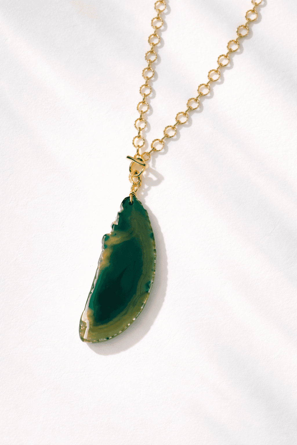 Цепь с крупным срезом агата напоминает свежесть весеннего ветра, который приносит запахи цветущих садов. Подвеска из агата, словно кусочек природы, добавляет яркие акценты в ваш образ и наполняет его энергией. Материалы: натуральный агат, фианиты. Фурнитура из латуни покрыта золотом. Длина цепочки: 78 см. Длина подвески: 10 см.
