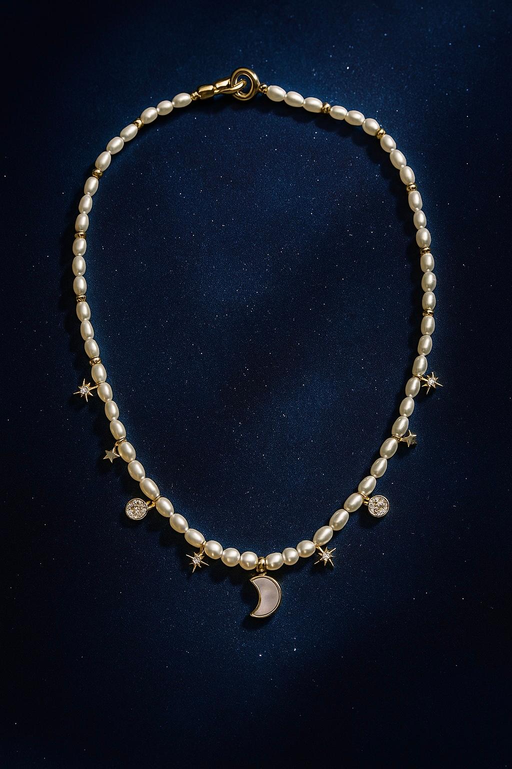 Этот нежный чокер напоминает волшебный сон, в котором звезды и луна танцуют свой удивительный танец. Материалы: натуральный культивированный жемчуг, фианиты, перламутр. Фурнитура из латуни покрыта золотом. Длина: 43см.