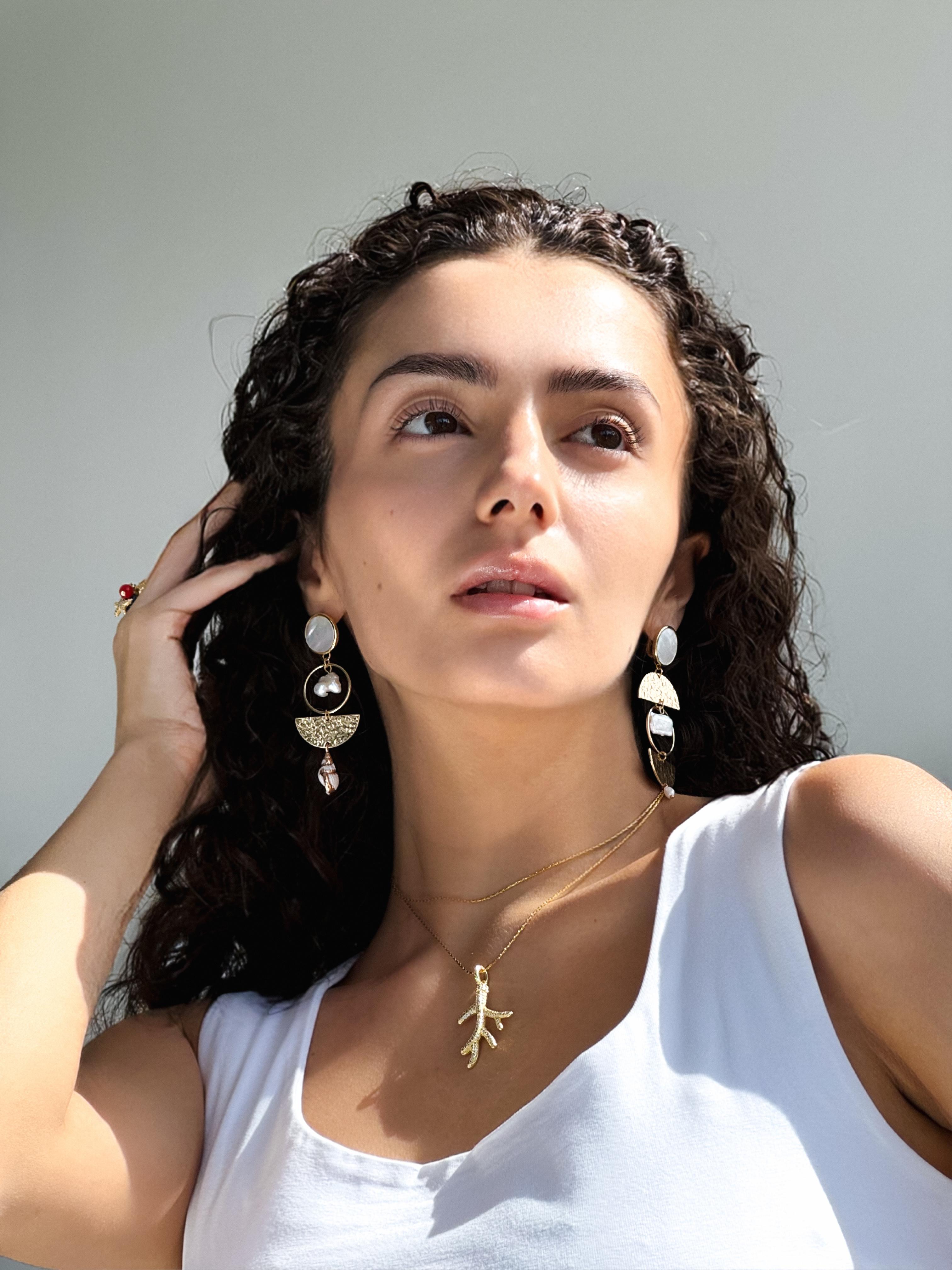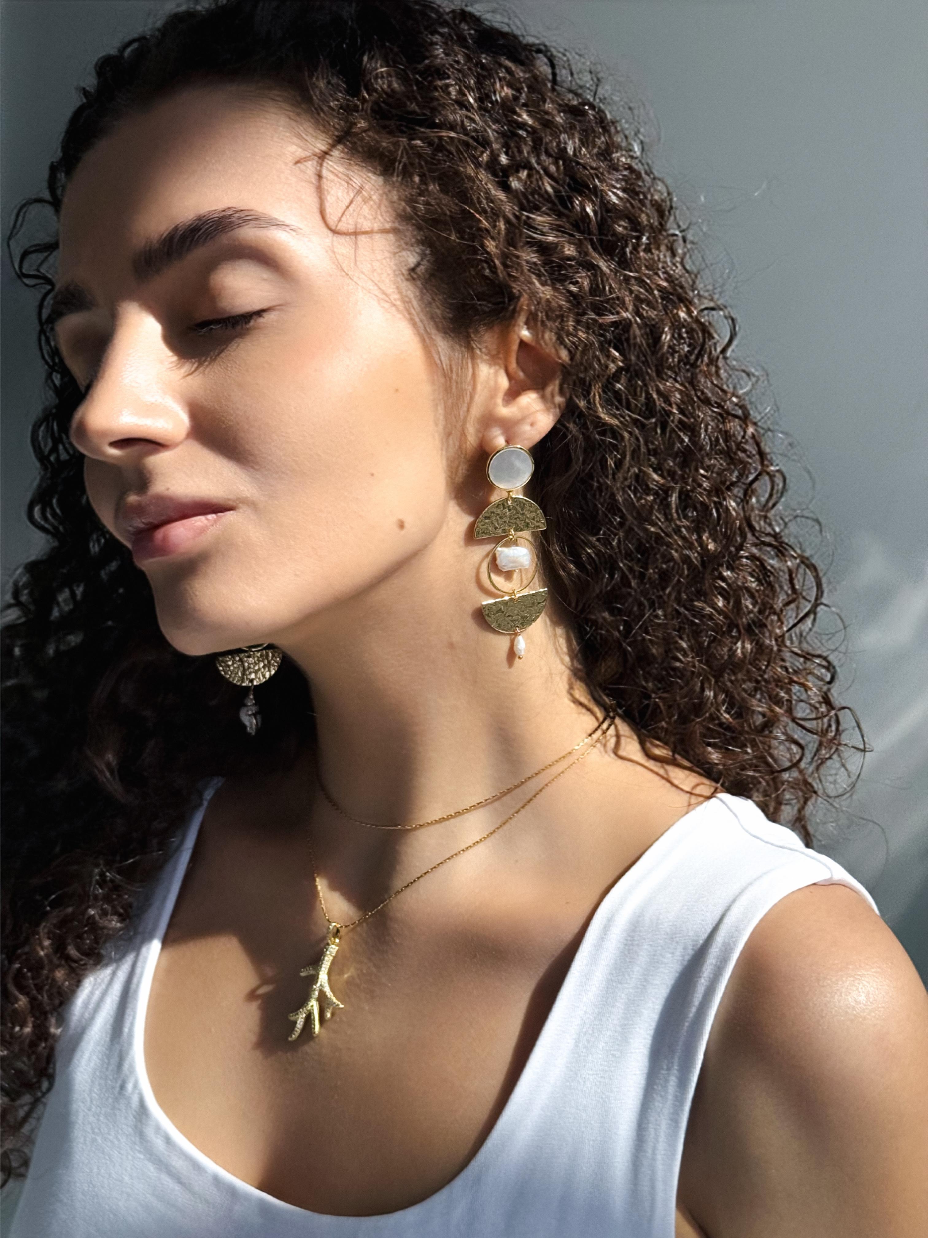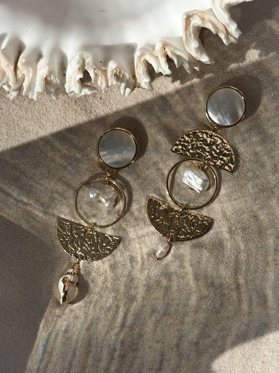 Таинственное мерцание этих сережек напоминает игру солнечных бликов на поверхности моря. Они добавят вашему образу нотки волшебства и загадочности. Материалы: натуральный перламутр, натуральный культивированный жемчуг, ракушка. Фурнитура из латуни покрыта золотом. Длина: 7,5см.