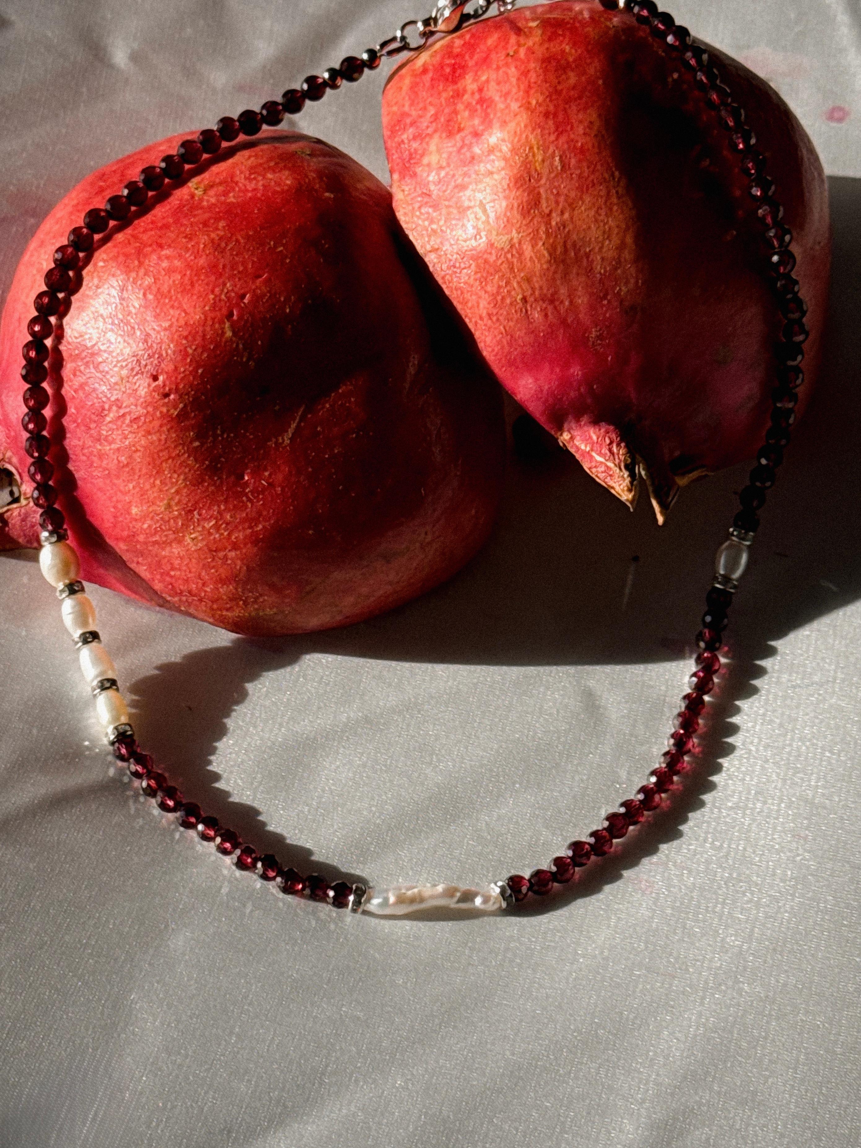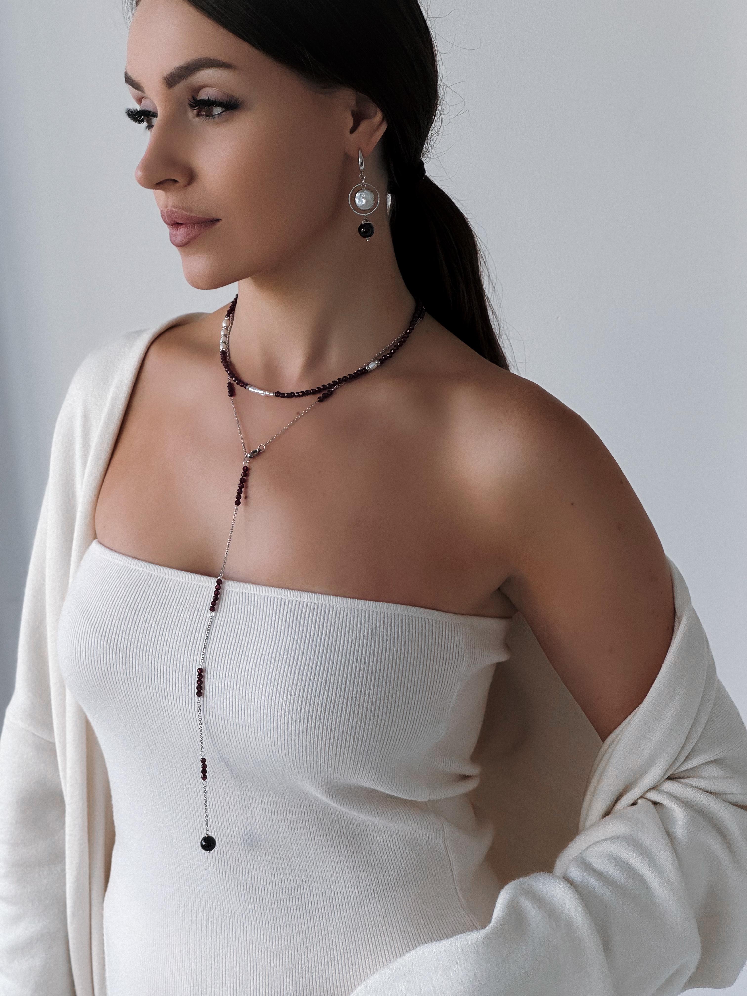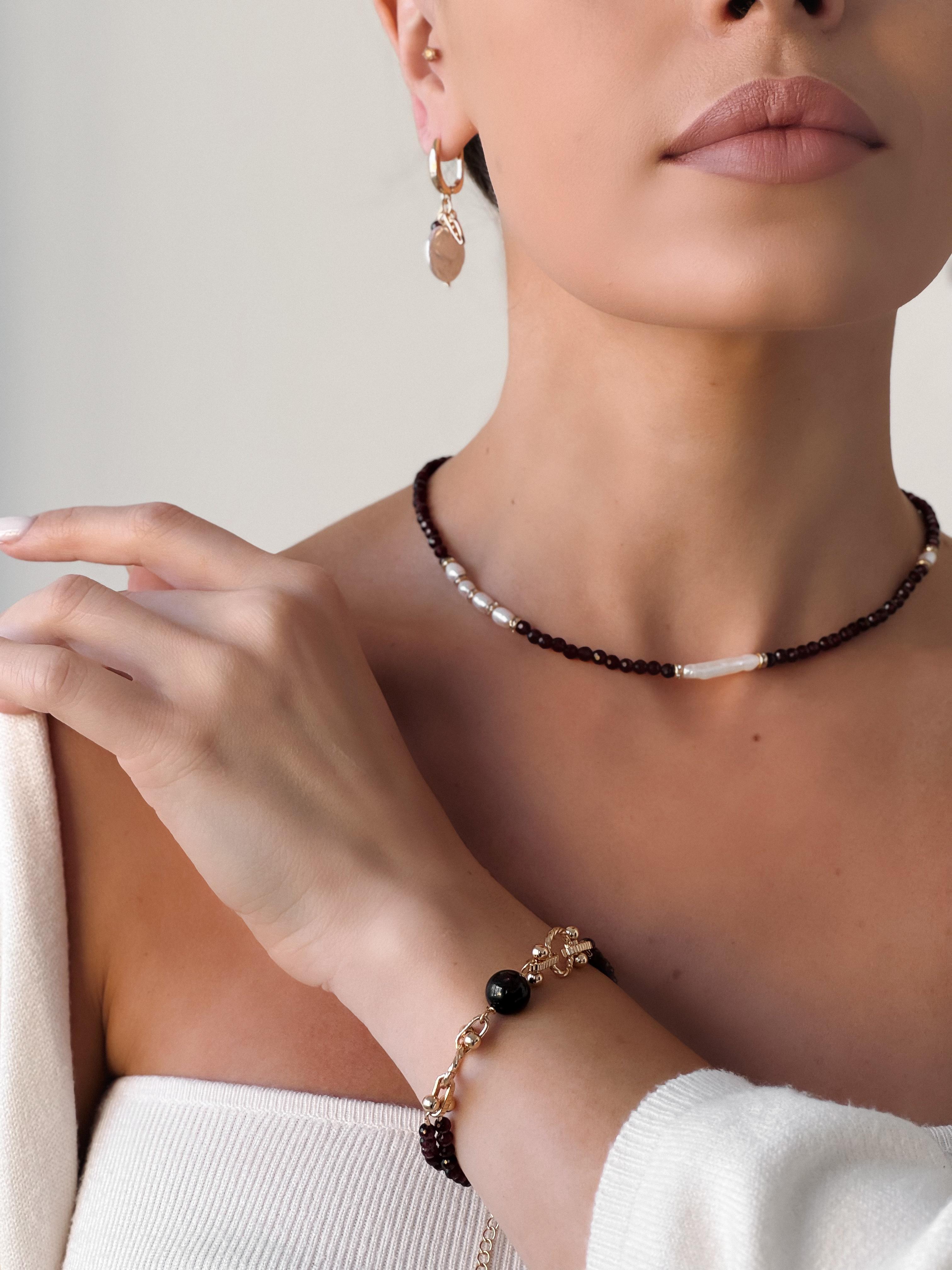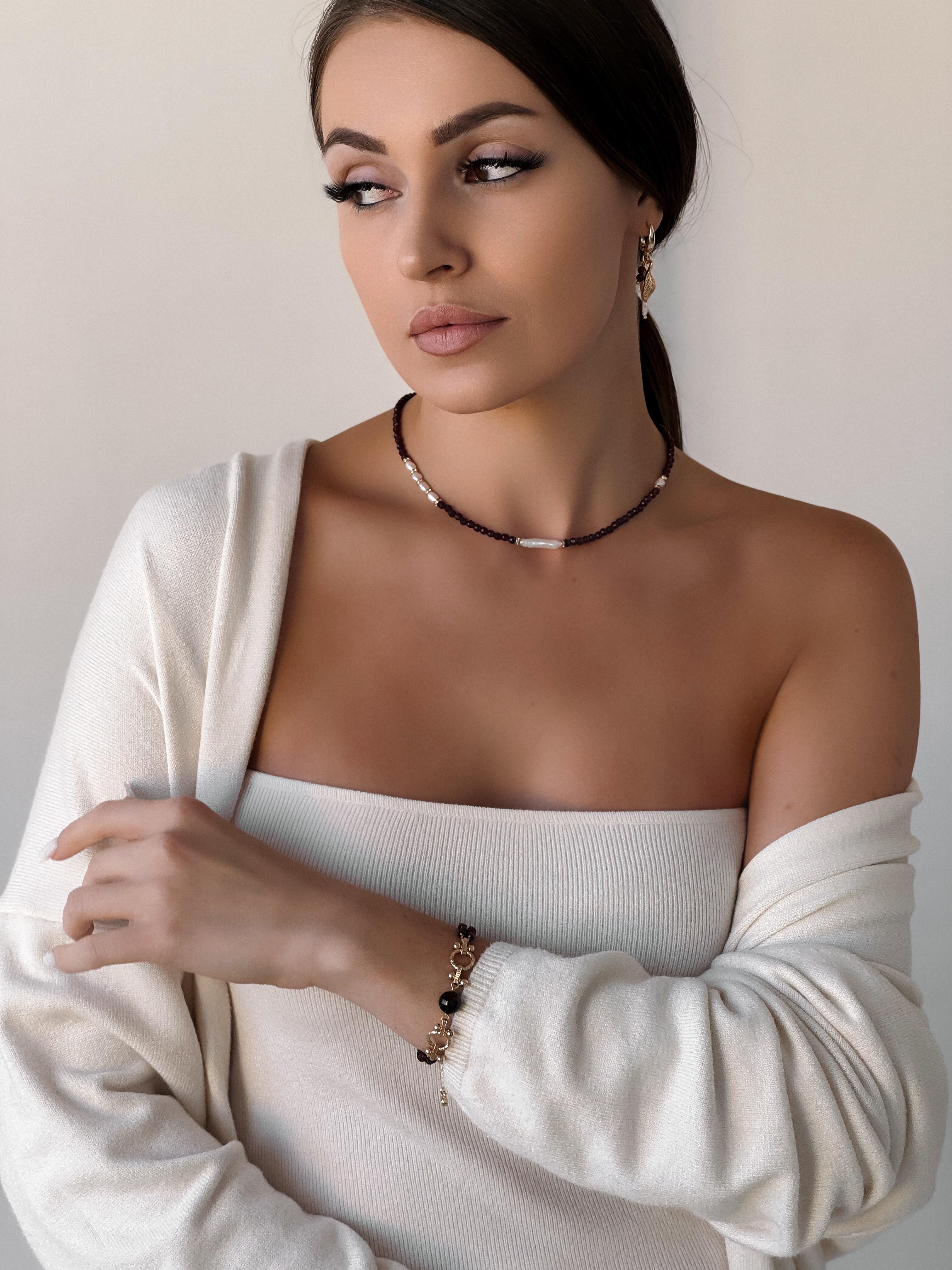 Этот чокер символизирует глубокую связь с окружающим миром. Деликатное сочетание граната и жемчуга говорит о чувственности и эмпатии, которыми наполнена женщина, чувствующая мир. Материалы: натуральный гранат, натуральный культивированный жемчуг, ювелирные кристаллы. Фурнитура из латуни покрыта золотом. Длина: 39см + 5см.