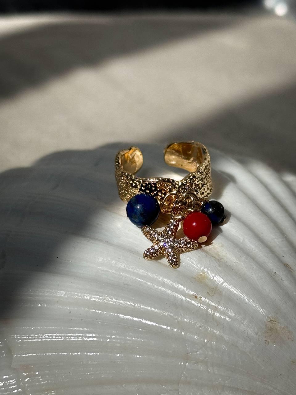 Это кольцо - символ страсти и эмоций. Оно подчеркивает ваше умение чувствовать глубоко и искренне. Материалы: натуральные коралл и лазурит, фианиты. Фурнитура из латуни покрыта золотом. Размер регулируется.