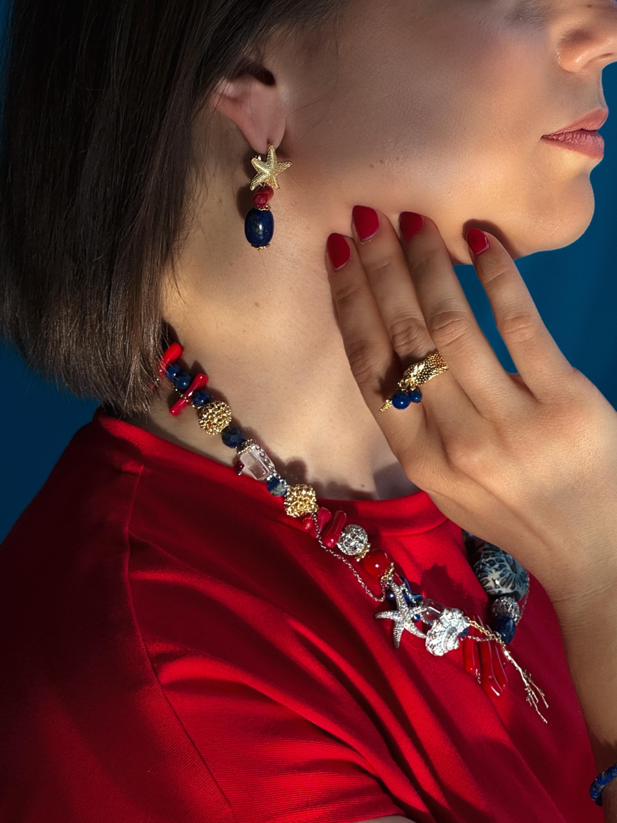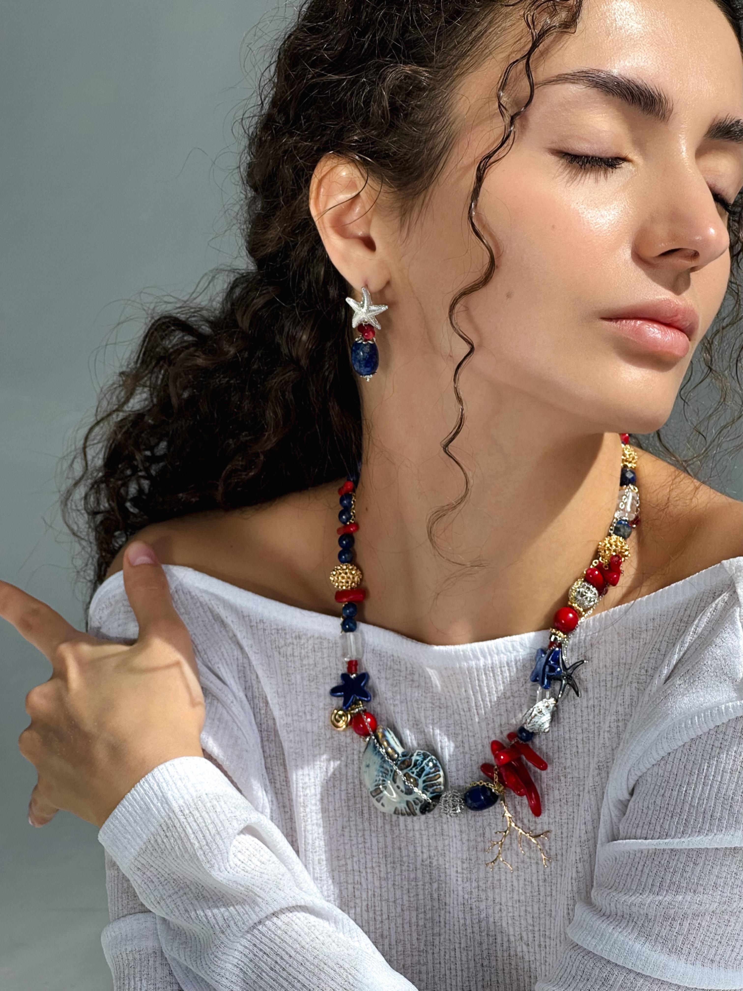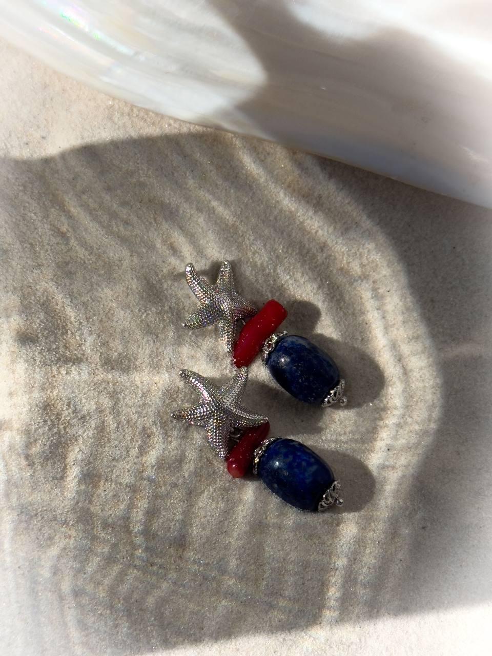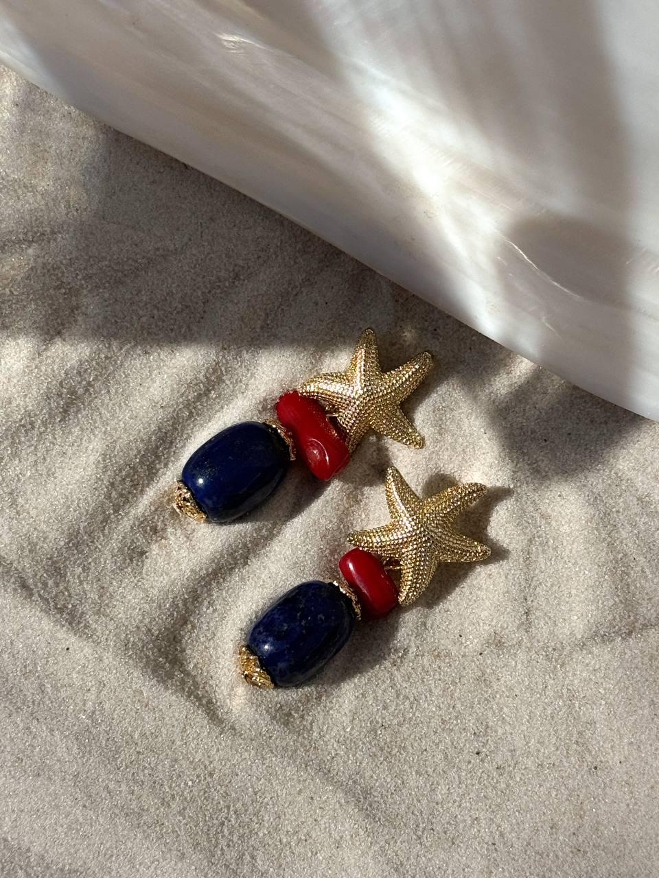 Эти серьги словно исполняют мелодию океана. Они напоминают о вашей красоте и внутренней силе, готовой быть услышанной. Материалы: натуральные лазурит и коралл, фианиты. Фурнитура из латуни покрыта золотом/родием. Длина: 4см.