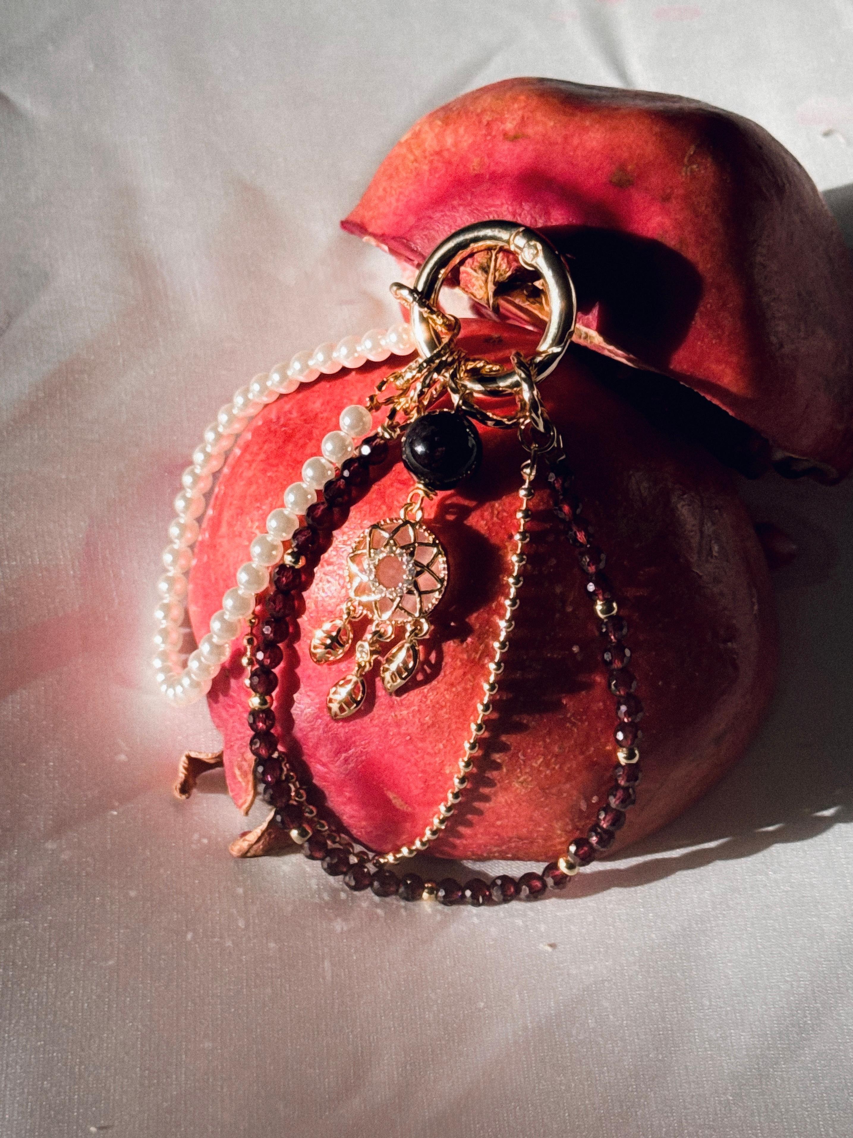 Этот брелок символизирует внутренний свет и искренность. Гранат олицетворяет внутреннюю силу, а жемчуг — чистоту. Собранные вместе, они создают гармонию в жизни женщины. Материалы: натуральный гранат, жемчуг Майорка, фианиты. Фурнитура из латуни покрыта золотом. Длина: 10,5см.