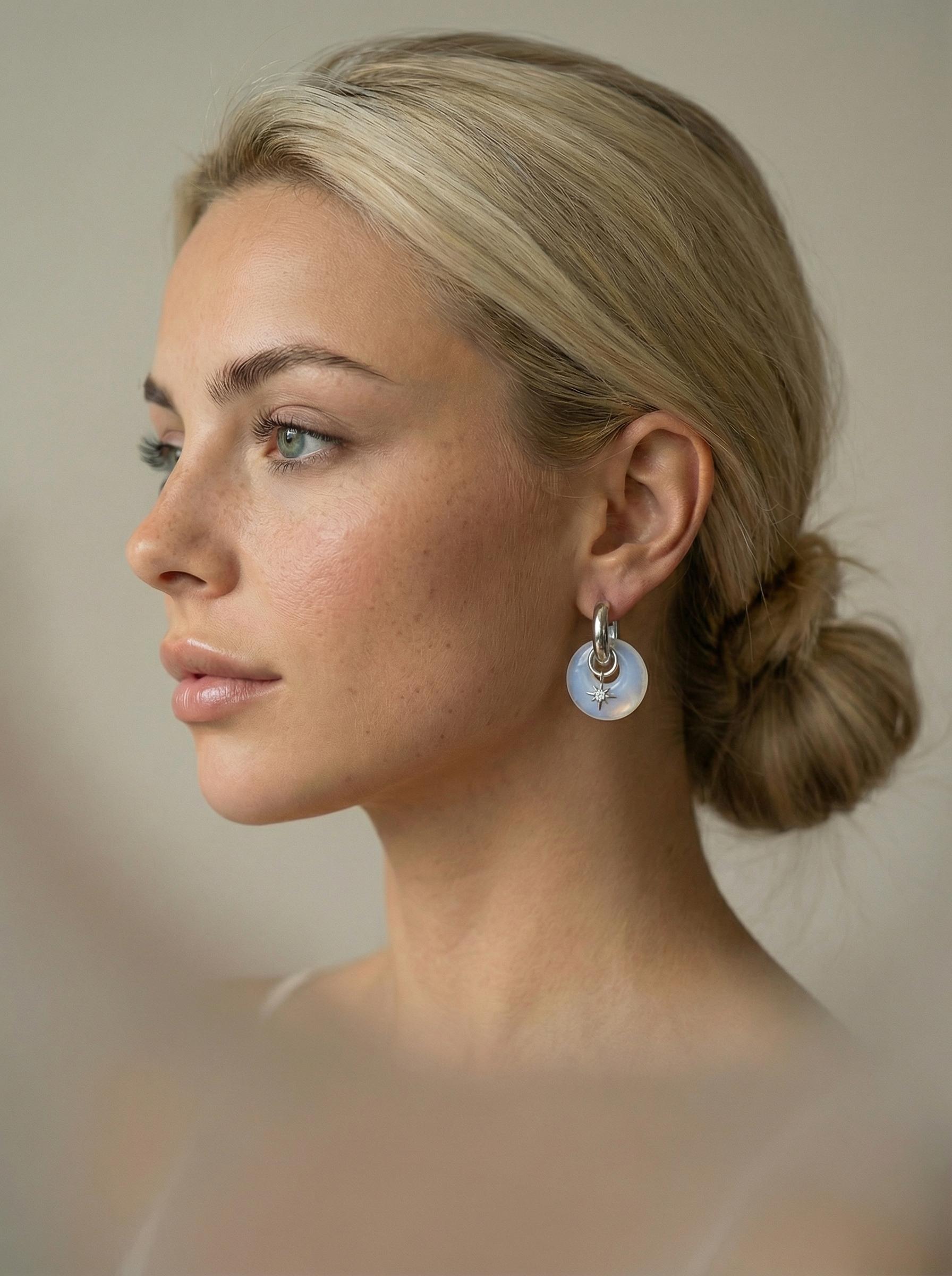 Эти серьги-трансформеры отражают волшебство ночного неба. Они символизируют интуицию, женскую энергию и мечтательность. Материалы: лунный камень, фианиты. Фурнитура из латуни покрыта родием. Длина: 2,5см.