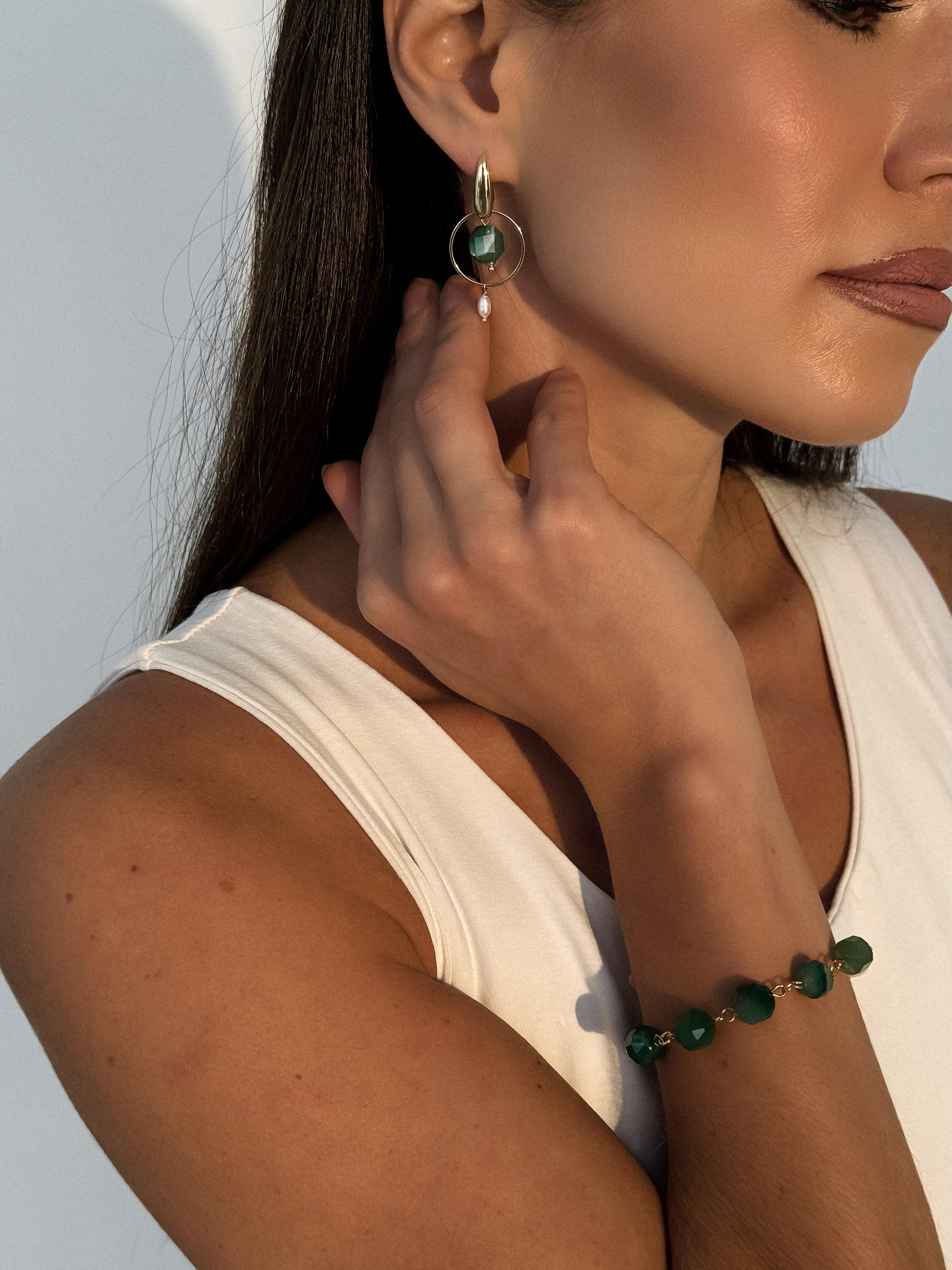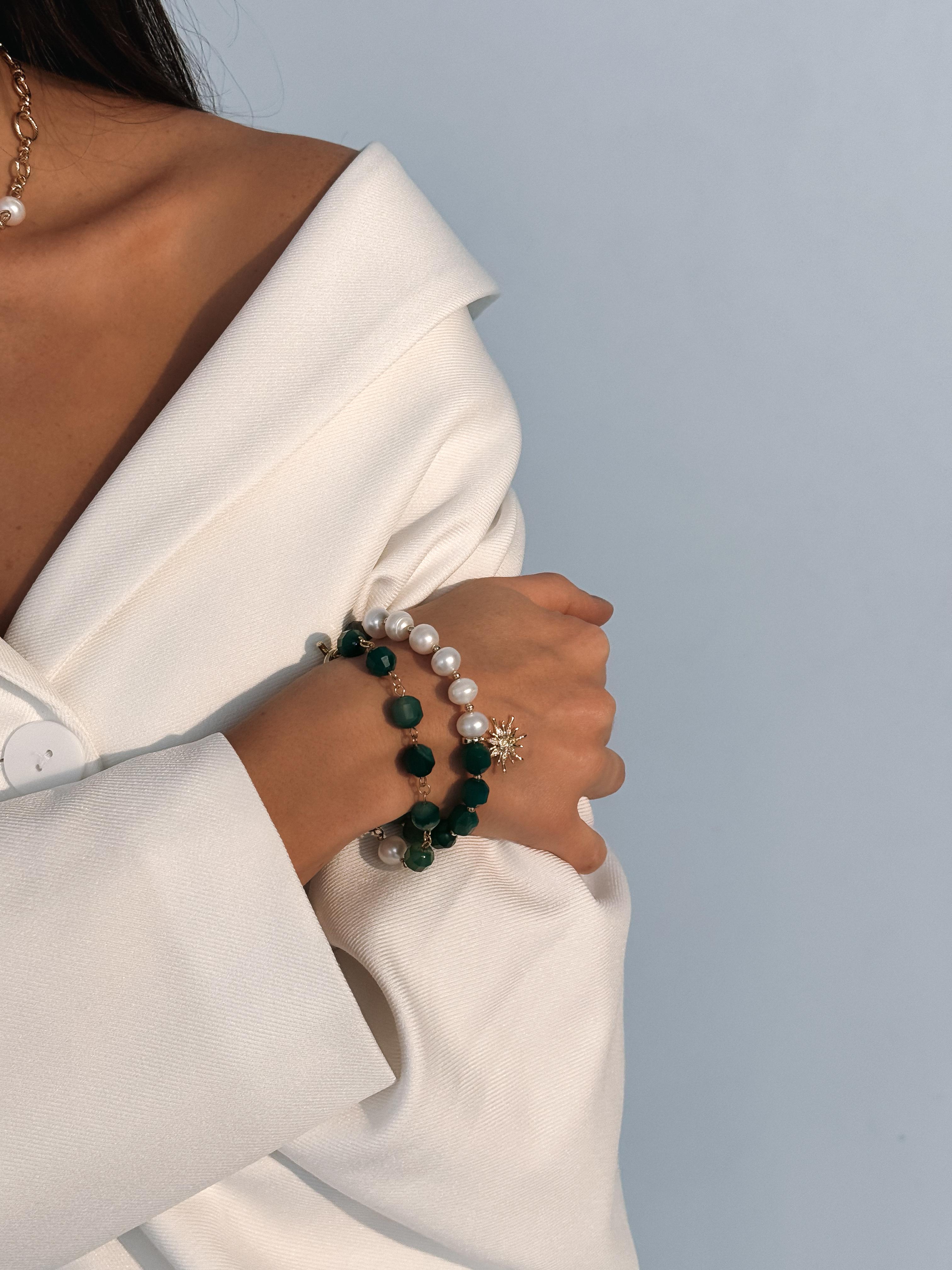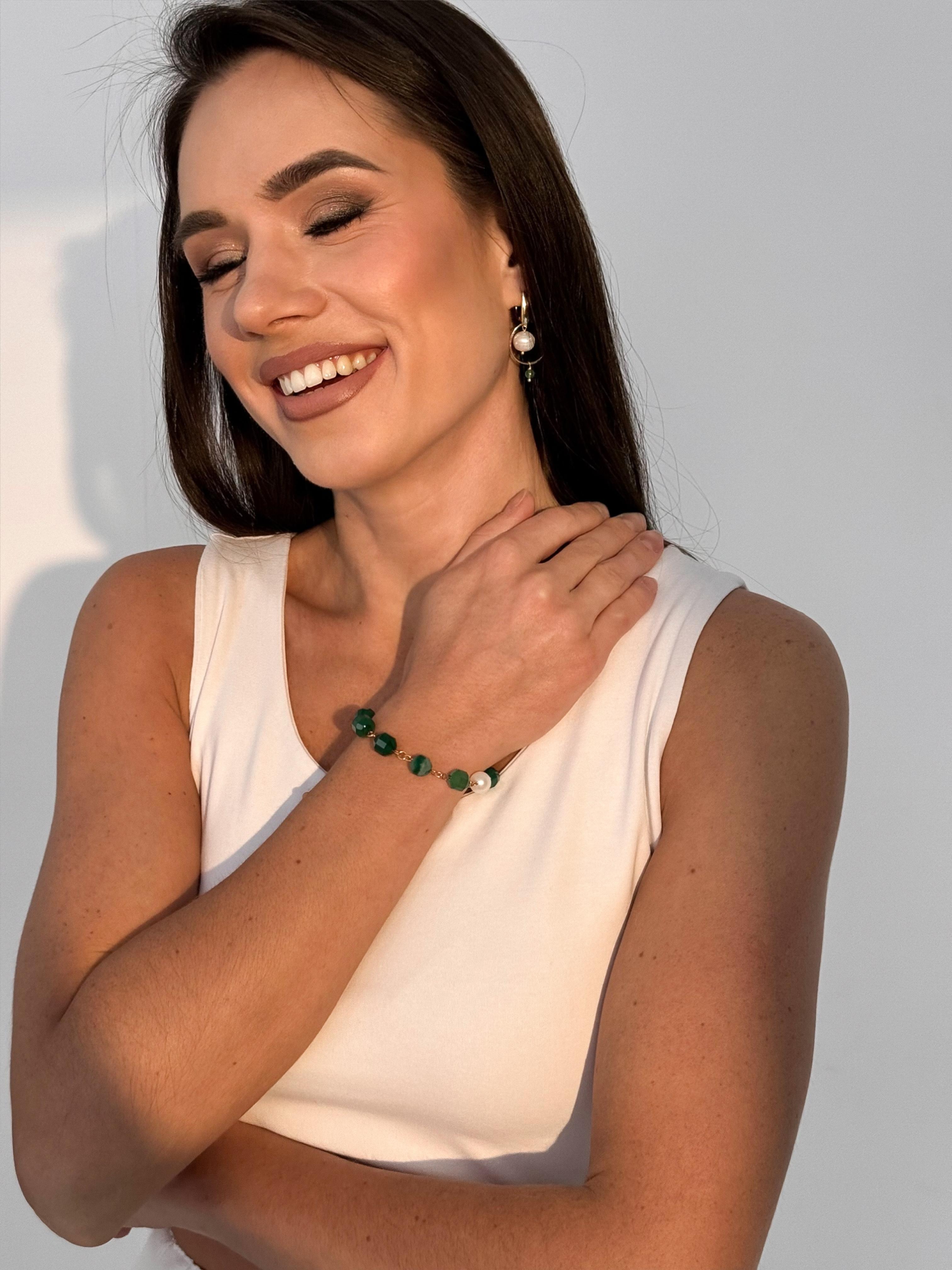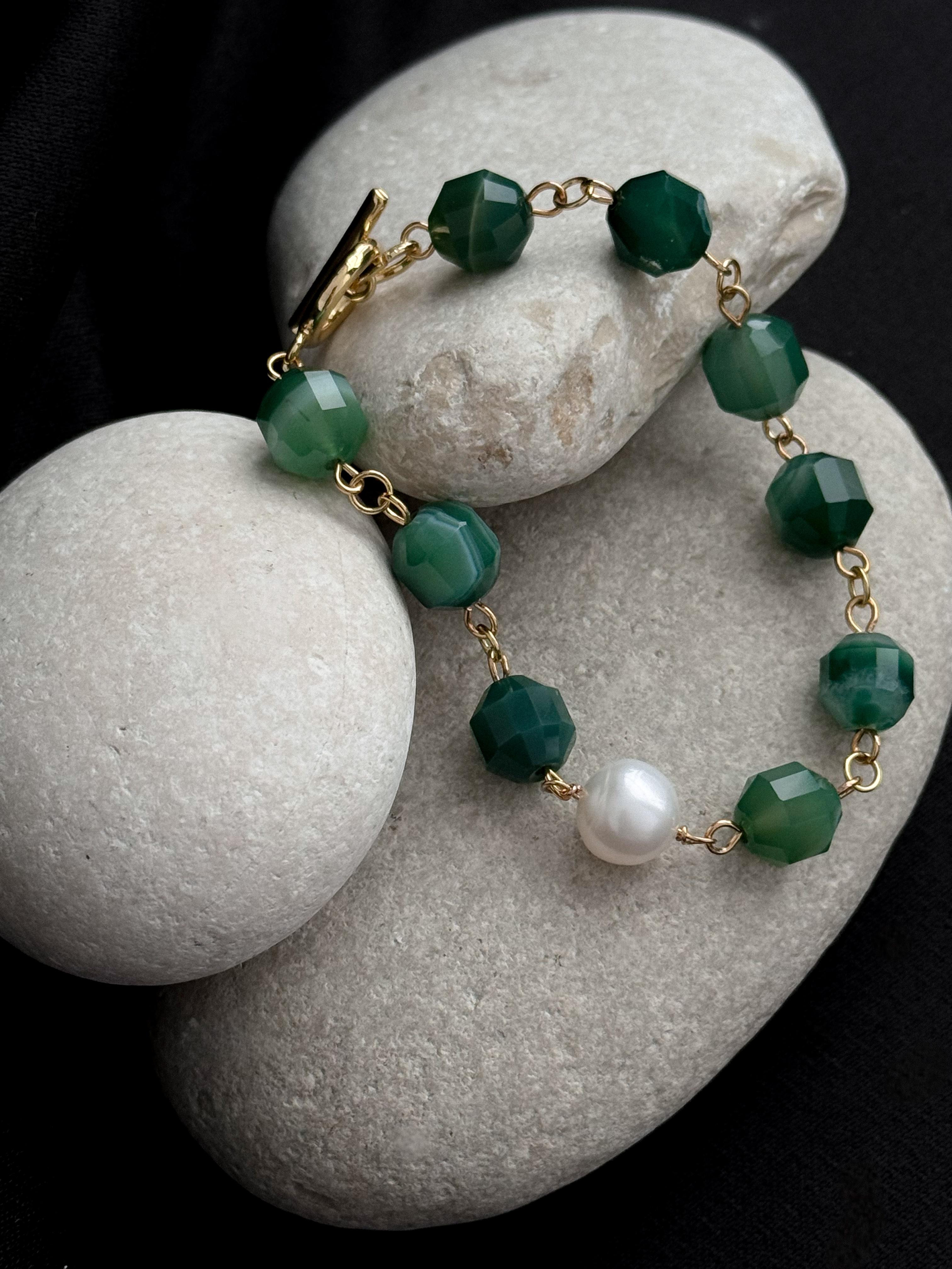 Браслет, который соединяет в себе простоту и элегантность. Он символизирует раннее майское утро, когда природа пробуждается и расцветает, наполняя мир красотой и гармонией. Материалы: натуральный агат, натуральный культивированный жемчуг. Фурнитура из латуни покрыта золотом. Длина: 20 см.