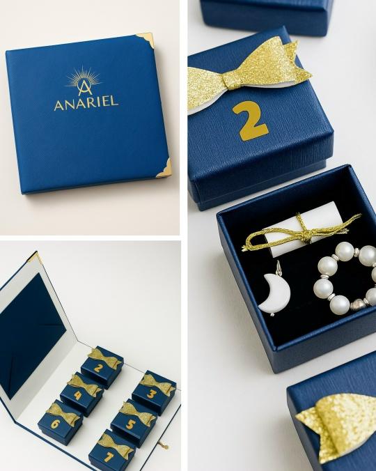 Адвент-календарь с украшениями. Такой календарь станет настоящим украшением ваших праздников! Календарь содержит в себе пару сережек-колец и подвески к ним — это настоящие сережки-трансформеры, которые позволят вам менять стиль в зависимости от настроения и наряда! Календарь рассчитан на 7 дней. Кроме сережек и подвесок к ним, в синем конверте, который открывается в первый день, вас ждут: - подарочный сертификат на украшения ANARIEL номиналом 1000р; - приветственное письмо с правилами пользования календарем; - карточку с пожеланием; - инструкция по уходу за украшениями и салфетку для чистки украшений. Двух одинаковых календарей нет, каждый набор сережек-трансформеров уникален. Материалы: Фурнитура из латуни покрыта родием. Подвески с натуральным культивированным жемчугом, перламутром, ювелирным кристаллом и жемчугом Майорка.