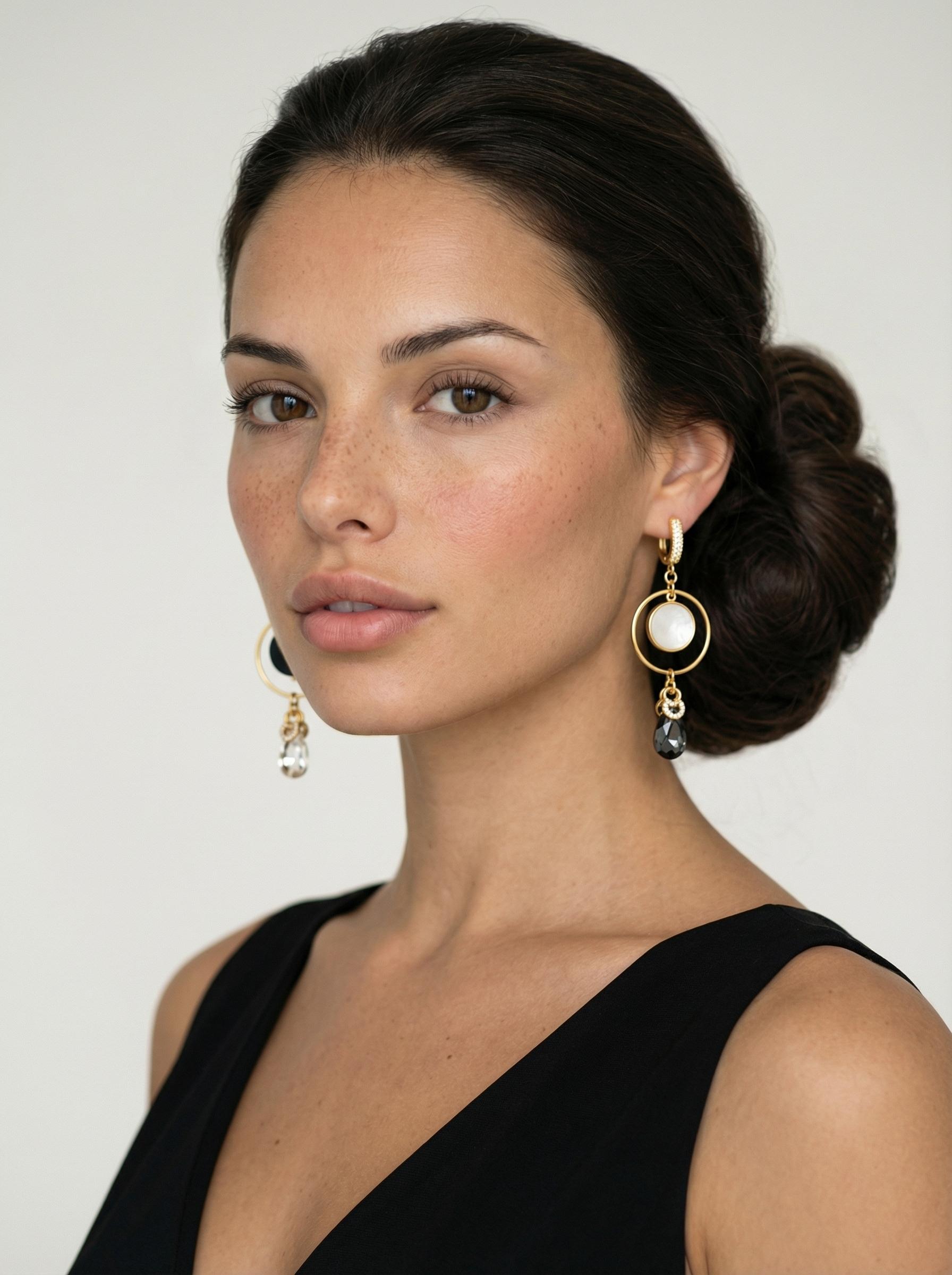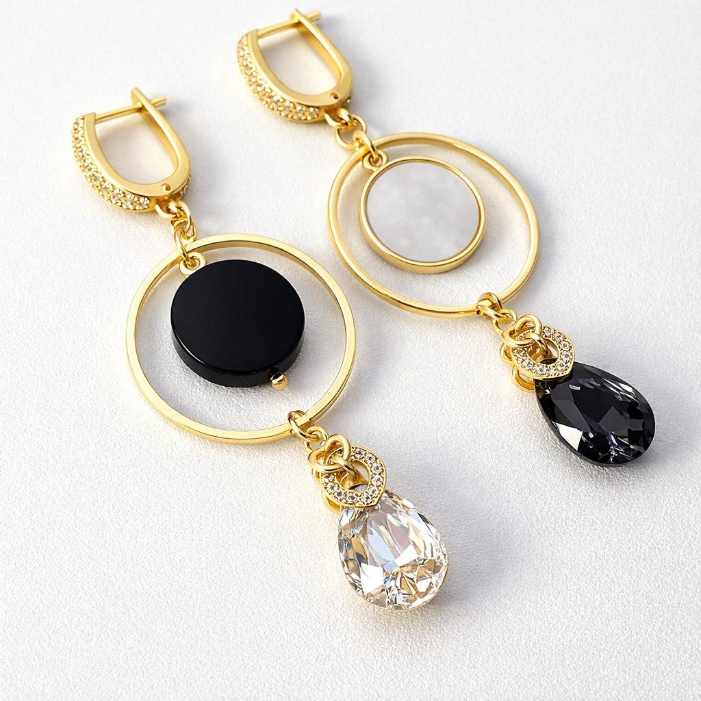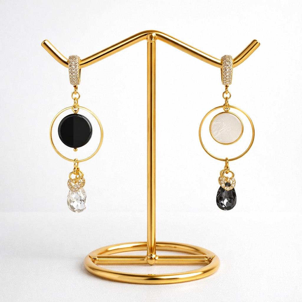 Эти серьги излучают ощущение полноты жизни и гармонии. Их дизайн и круглая форма напоминают о важности внутреннего баланса, помогая вам чувствовать себя целостной и уверенной в себе. Материалы: натуральные агат и перламутр, фианиты, ювелирные кристаллы. Фурнитура из латуни покрыта золотом. Длина: 7,5 см.