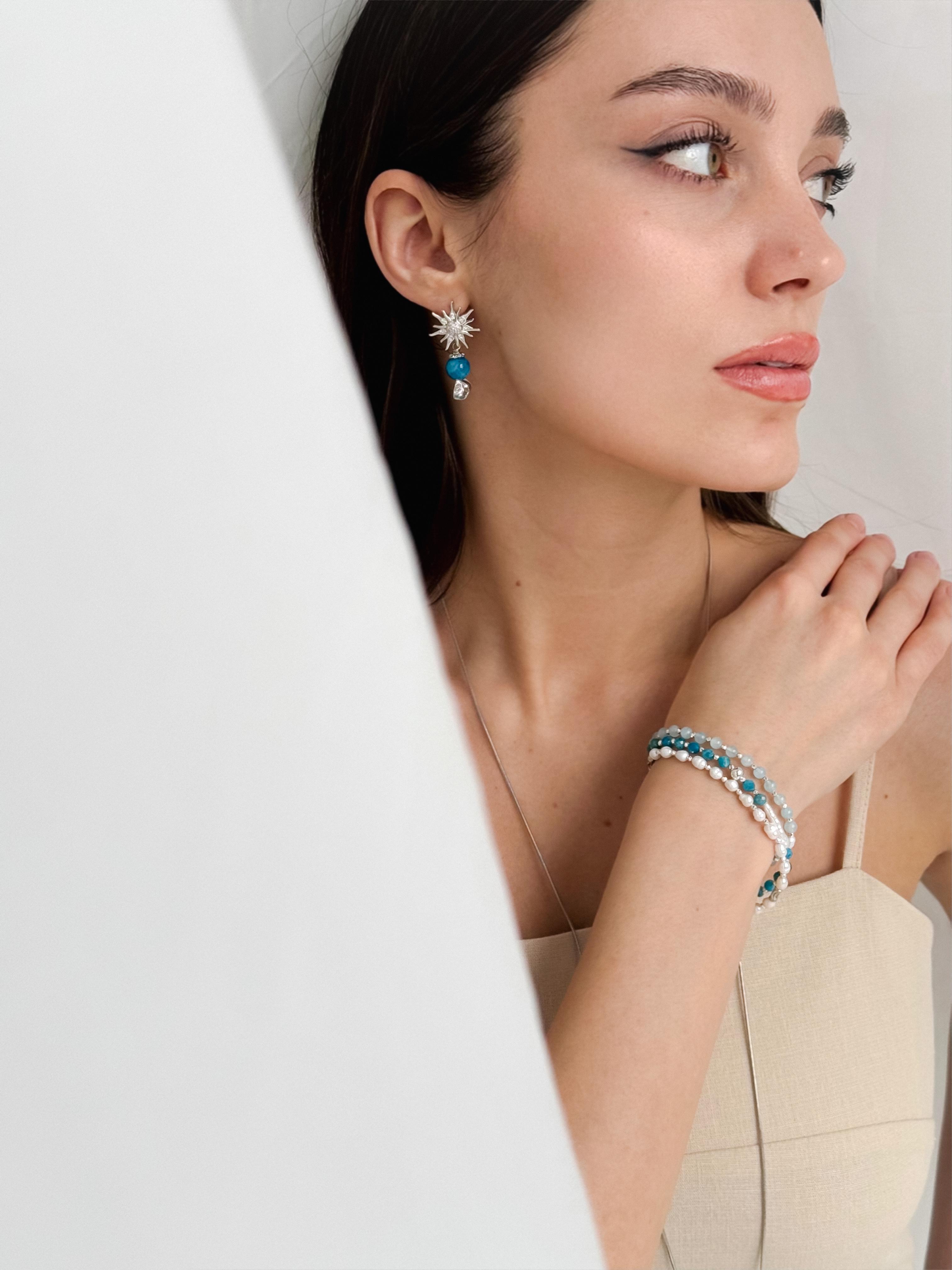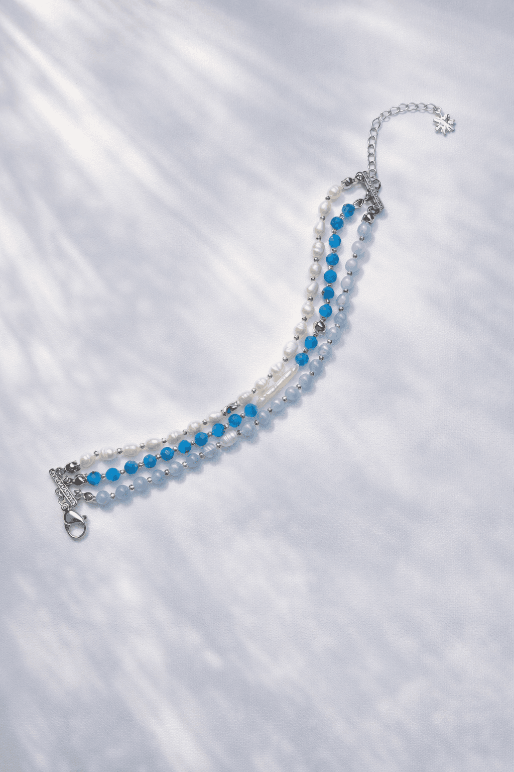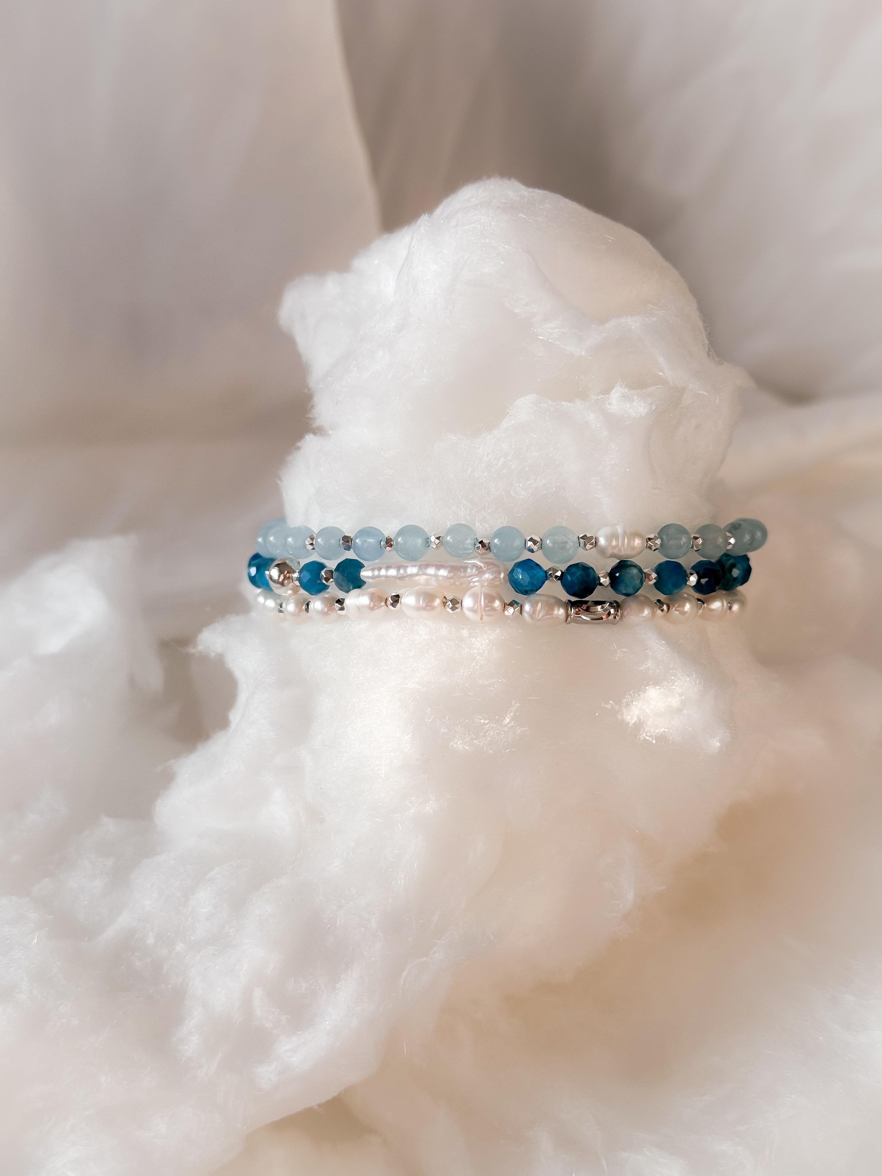 Этот браслет напоминает необъятные просторы бескрайнего неба. Он станет прекрасным дополнением вашего образа добавляя ему нежности и уникальности. Материалы: натуральные апатит и аквамарин, натуральный культивированный жемчуг, фианиты, гематит. Фурнитура из латуни покрыта родием. Длина: 18см + удлинитель 5см.
