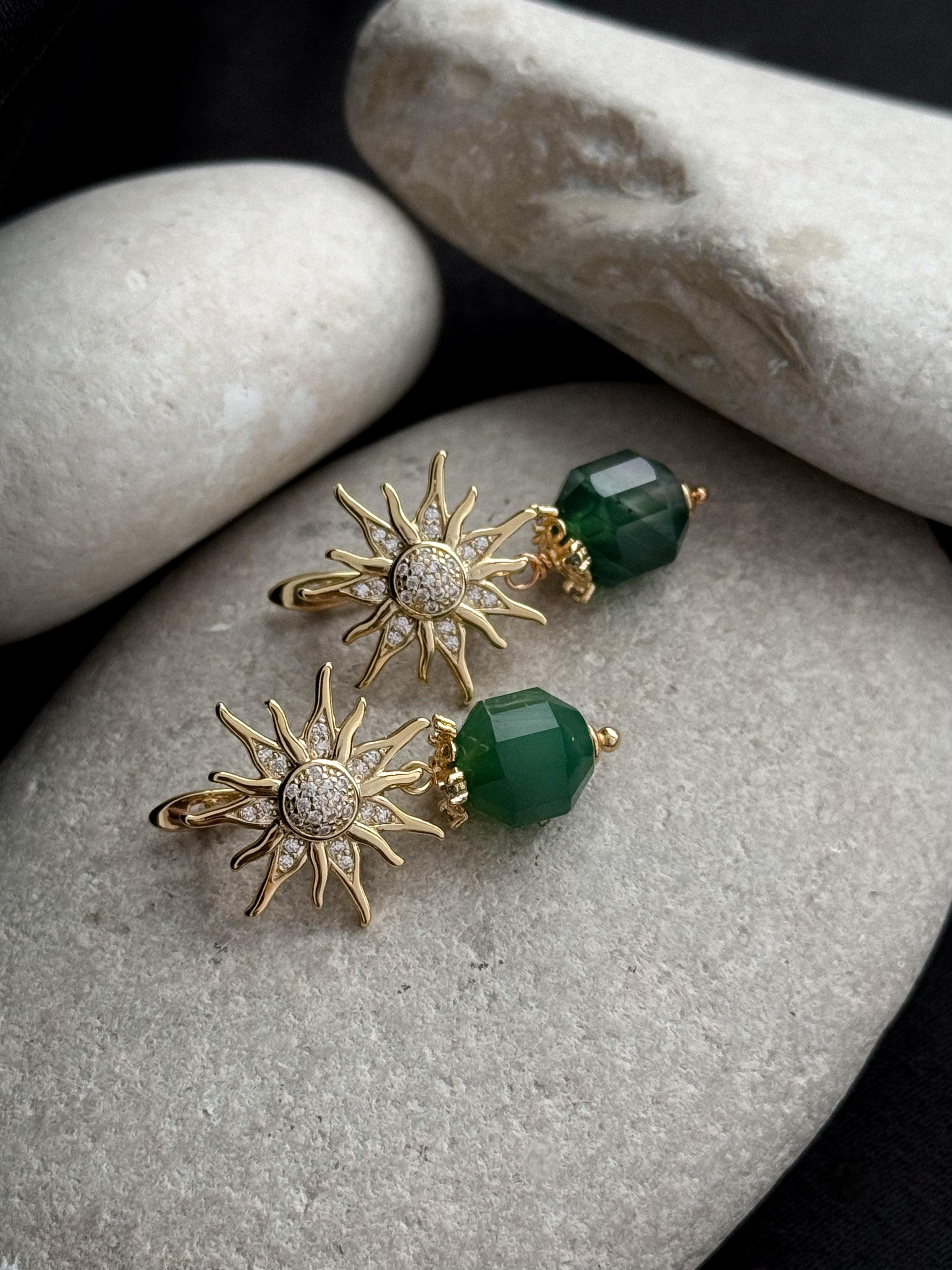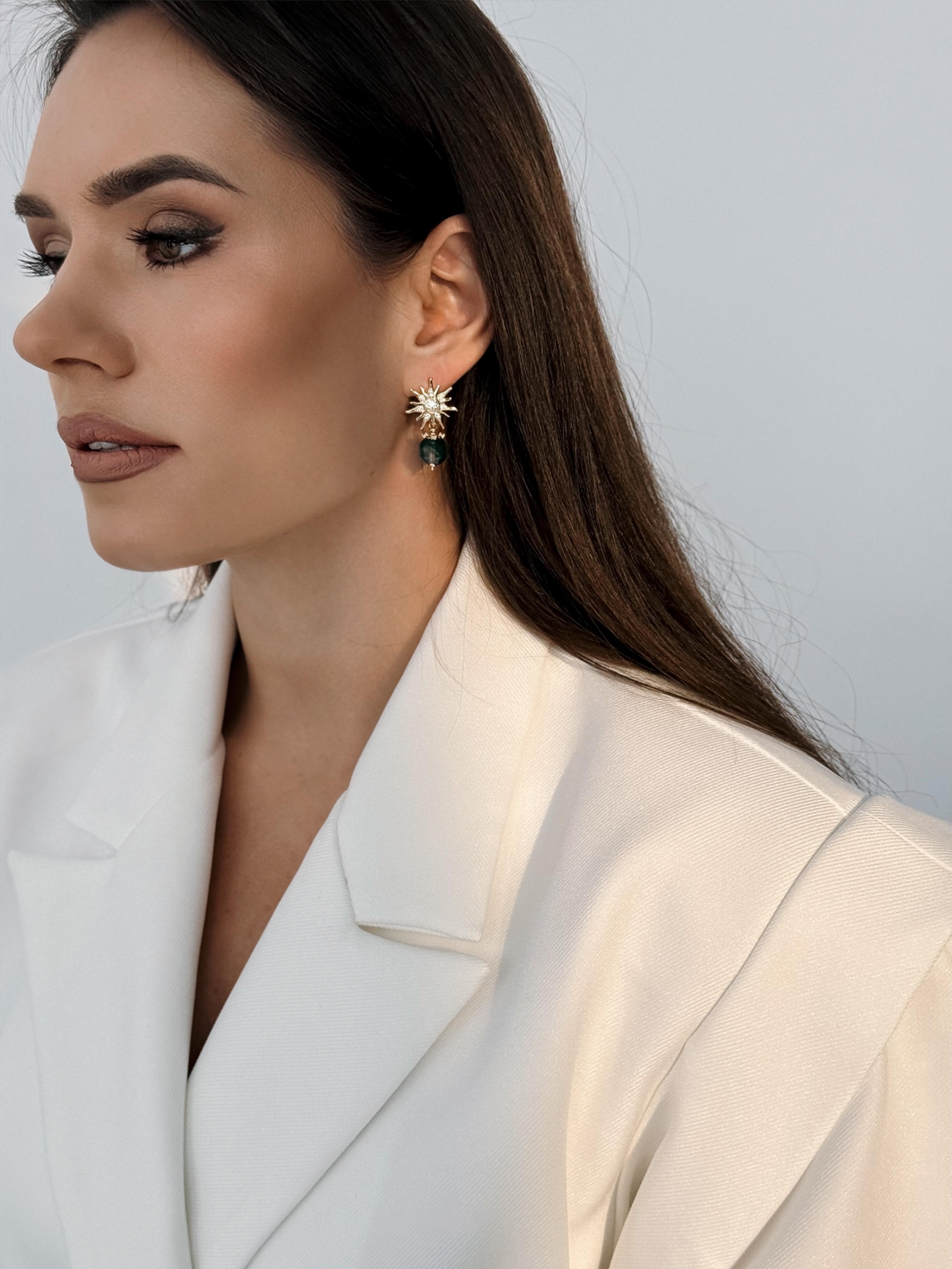Серьги с зеленым агатом символизируют первую зелень, которая появляется после долгой зимы. Это украшение вдохновляет на новые начинания и дарит радость от каждого солнечного дня. Материалы: натуральный агат, фианиты. Фурнитура из латуни покрыта золотом. Длина: 3см.