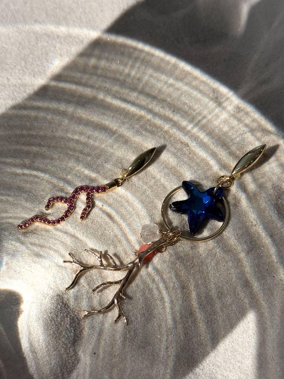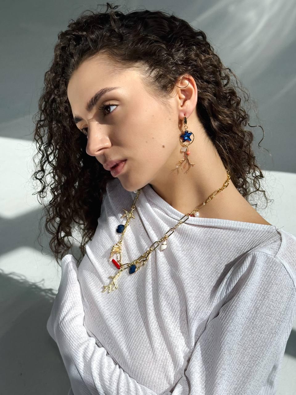 Эти серьги погружают в атмосферу подводного волшебства. Они отражают ваш яркий и необычный внутренний мир. Материалы: кристаллы Swarovski, натуральные коралл и горный хрусталь, фианиты. Фурнитура из латуни покрыта золотом. Длина: 8см и 5см.