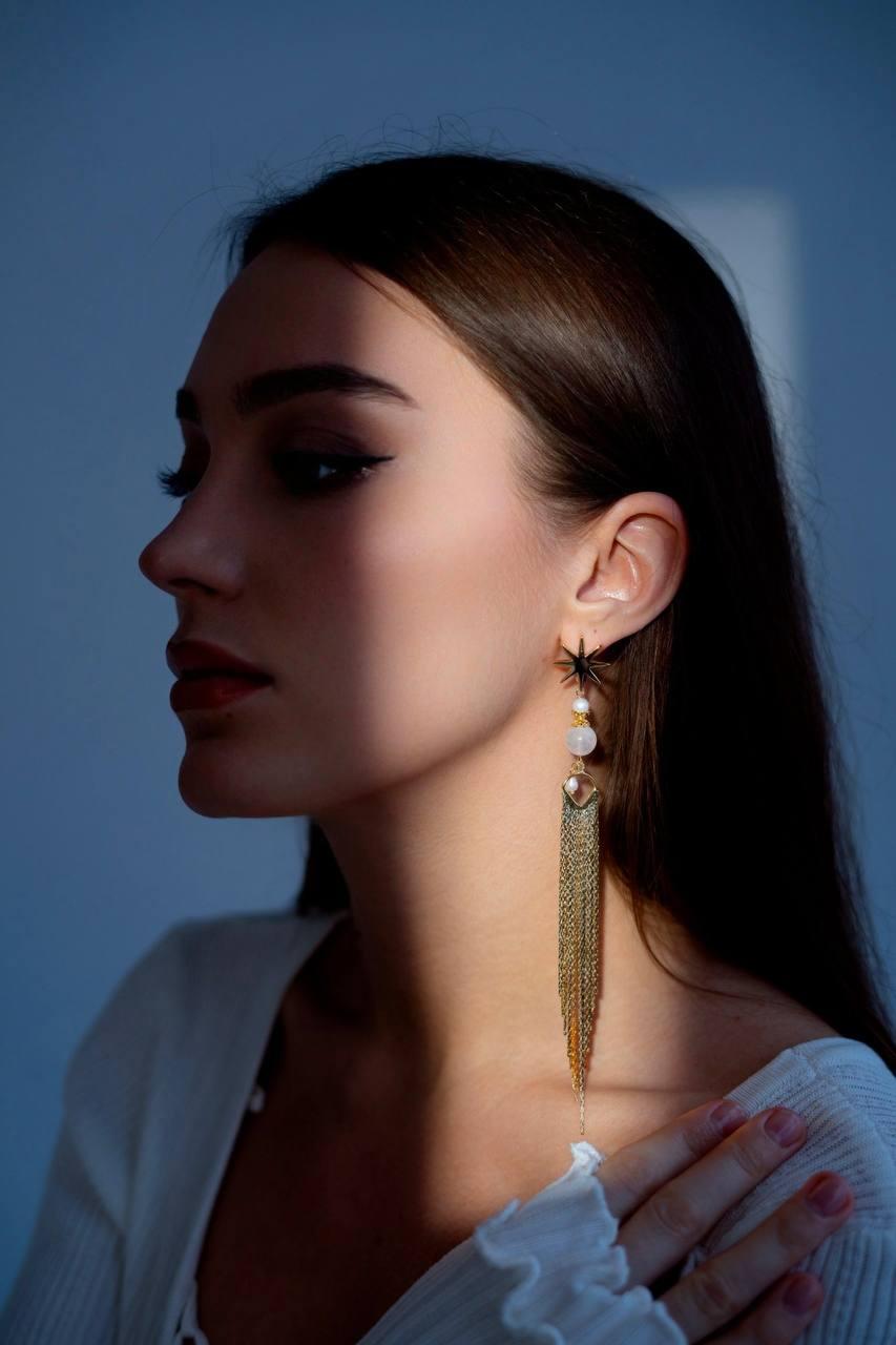 Моносерьга "Полет звезды" символизирует стремление к мечтам и веру в свое предназначение. Дизайн сережки словно уносит в бескрайние небеса, где каждая звезда светит ярче, освещая путь к новым достижениям. Материалы: лунный камень, натуральный культивированный жемчуг. Фурнитура из латуни покрыта золотом. Длина: 15,5 см.