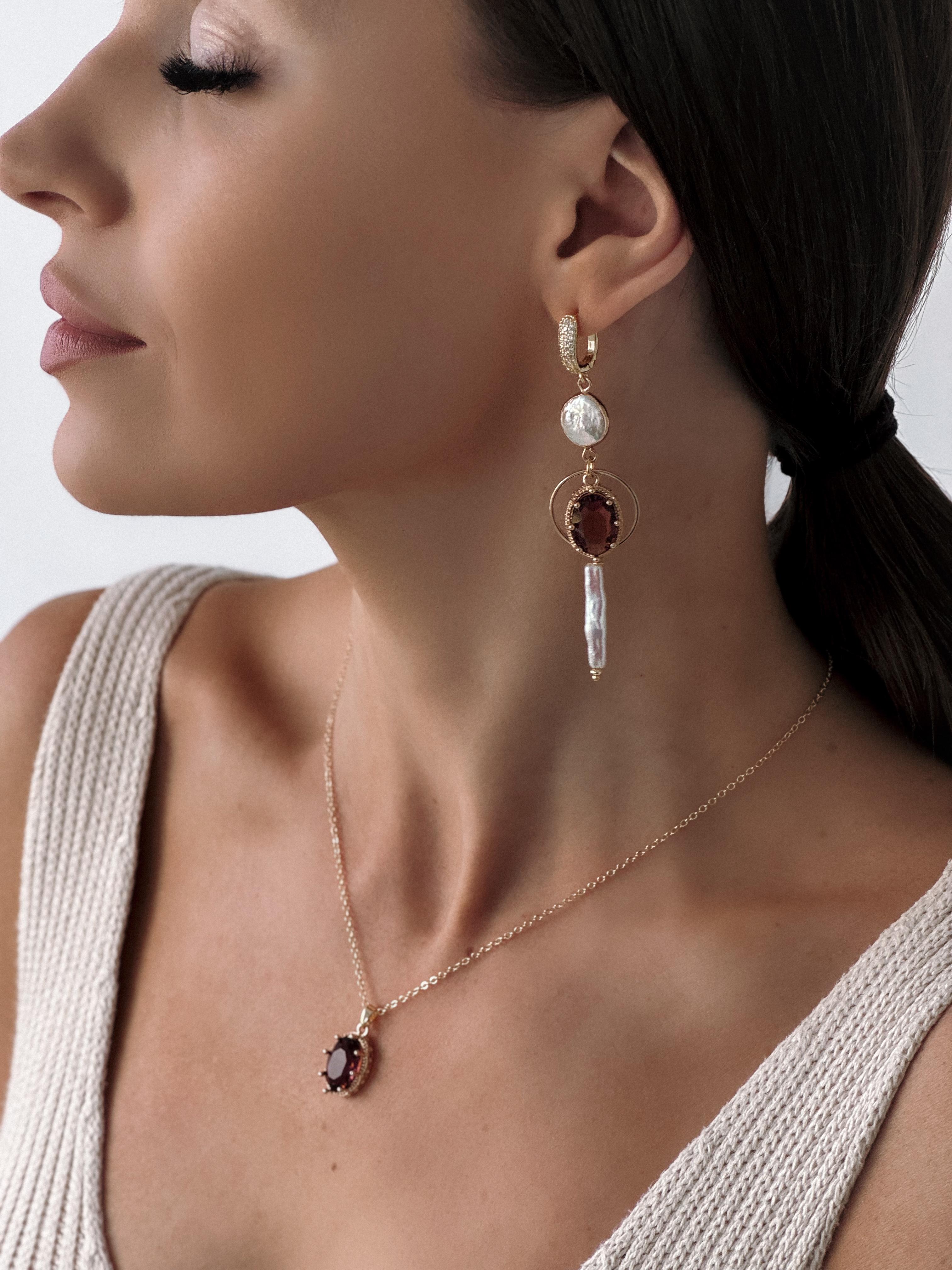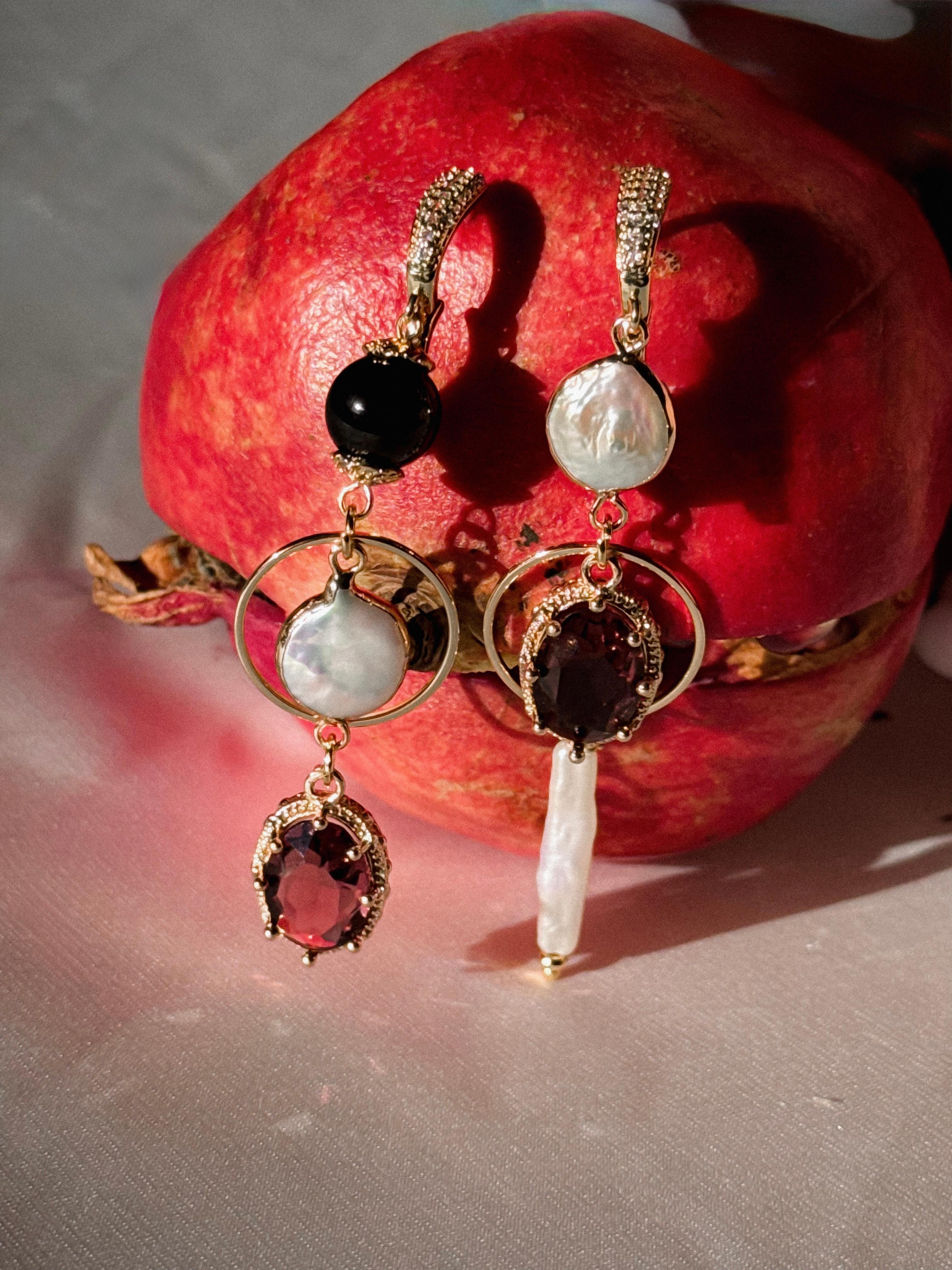 Элегантные серьги привлекают внимание и создают эффектный и притягательный образ. Асимметрия добавляет динамики, а сочетание нескольких материалов подчеркивает многообразие вашего внутреннего мира. Материалы: Натуральный культивированный жемчуг, натуральный гранат, ювелирные кристаллы. Фурнитура из латуни покрыта золотом. Длина: 7,5см и 8,5см.