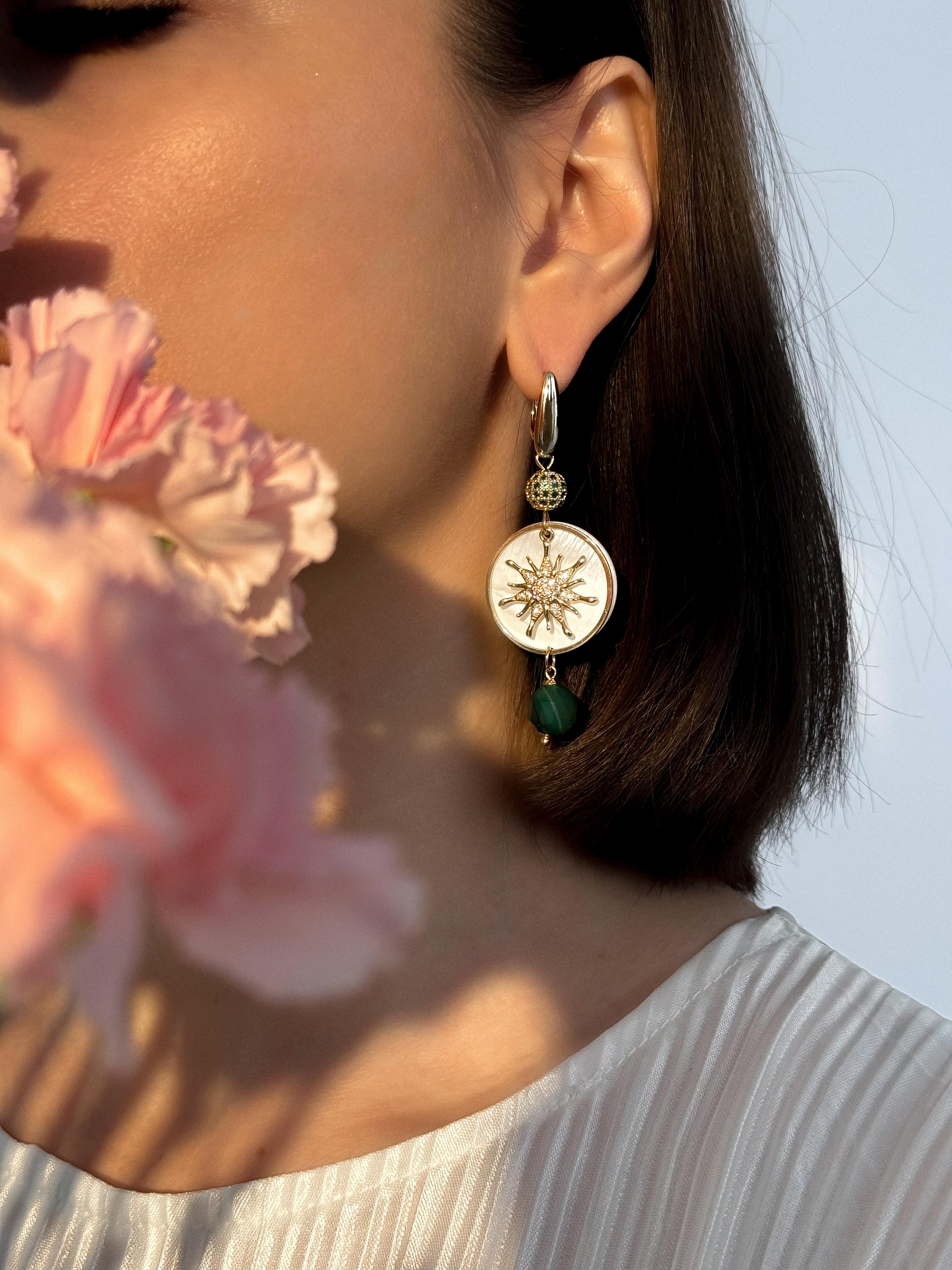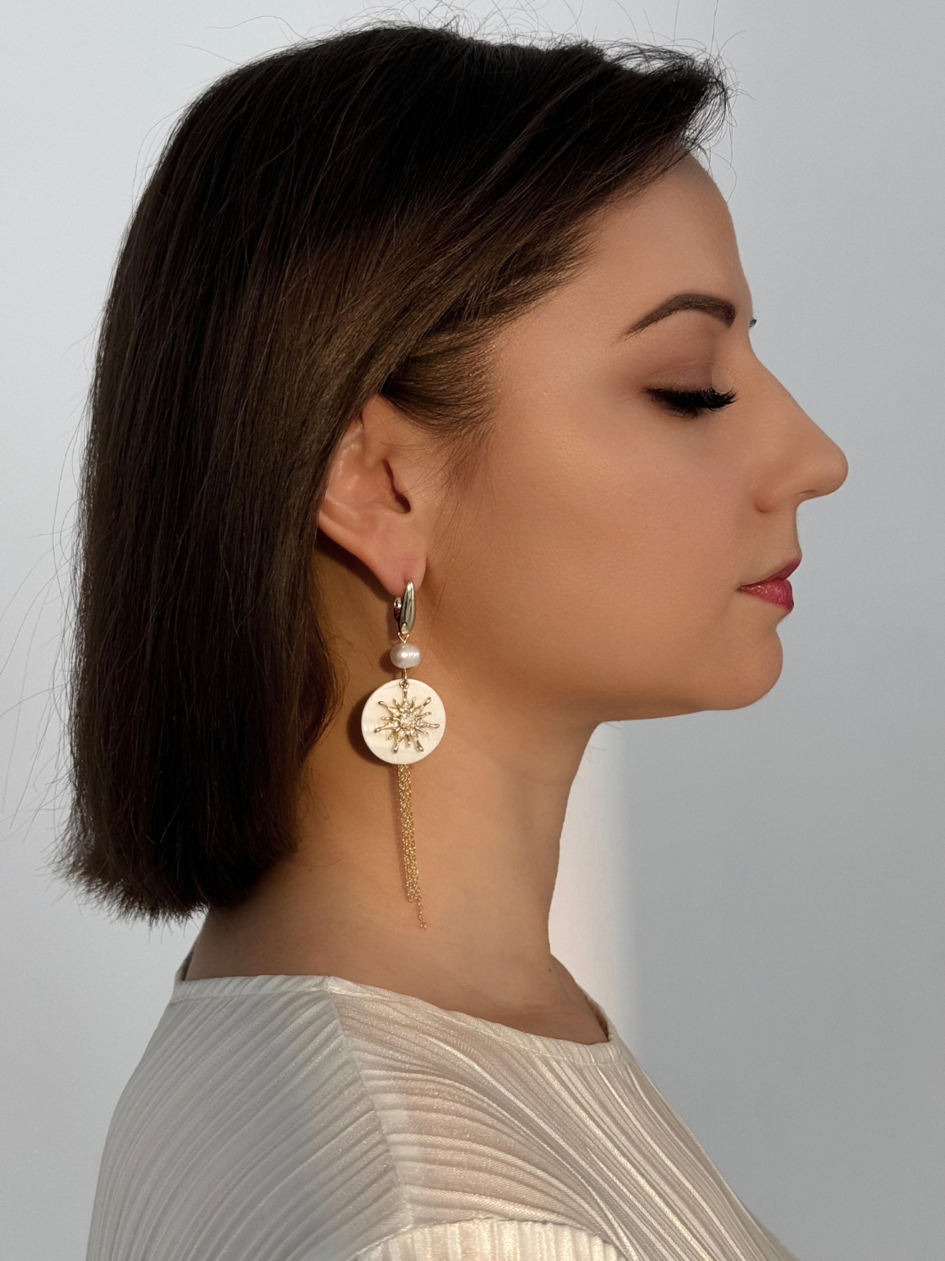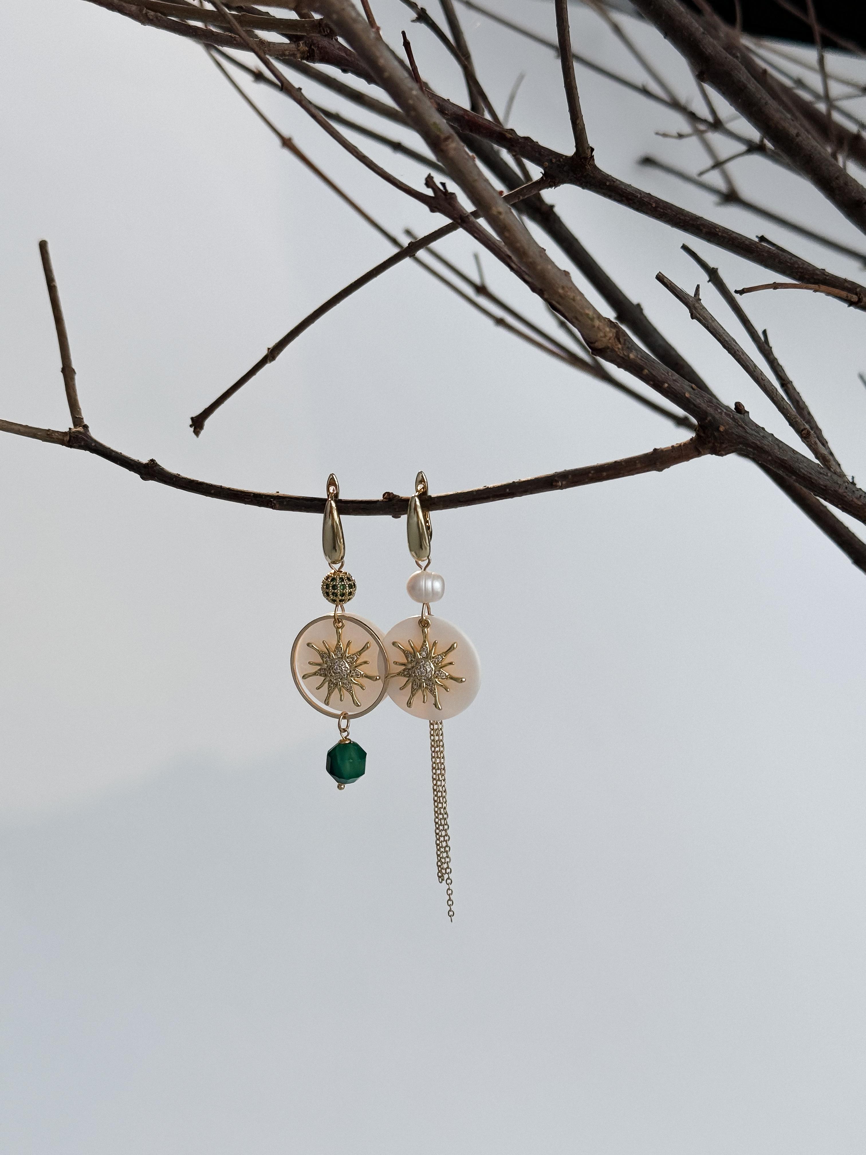 Длинные асимметричные серьги отражают гармонию весенних красок пробуждающейся природы, волшебную симфонию света и цвета. Материалы: Натуральный культивированный жемчуг, натуральный агат, перламутр, фианиты. Фурнитура из латуни покрыта золотом. Длина: 7 см и 10 см.
