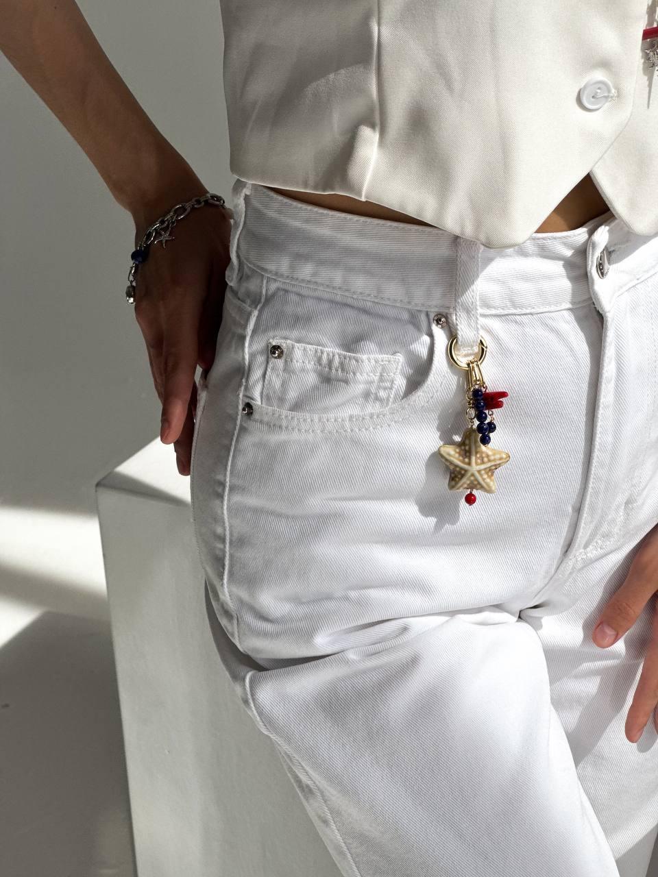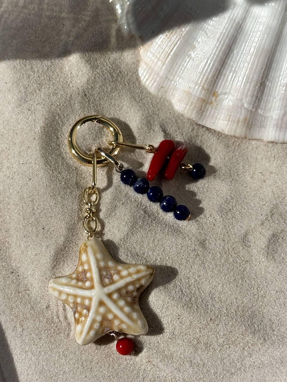 Этот брелок словно свет на вашем пути. Он напоминает о радости и самопознании, о неожиданных и приятных открытиях, которые вы совершаете. Такой аксессуар прекрасно смотрится на сумках или брюках. Материалы: натуральные коралл и лазурит, керамика. Фурнитура из латуни покрыта золотом. Длина: 9см.