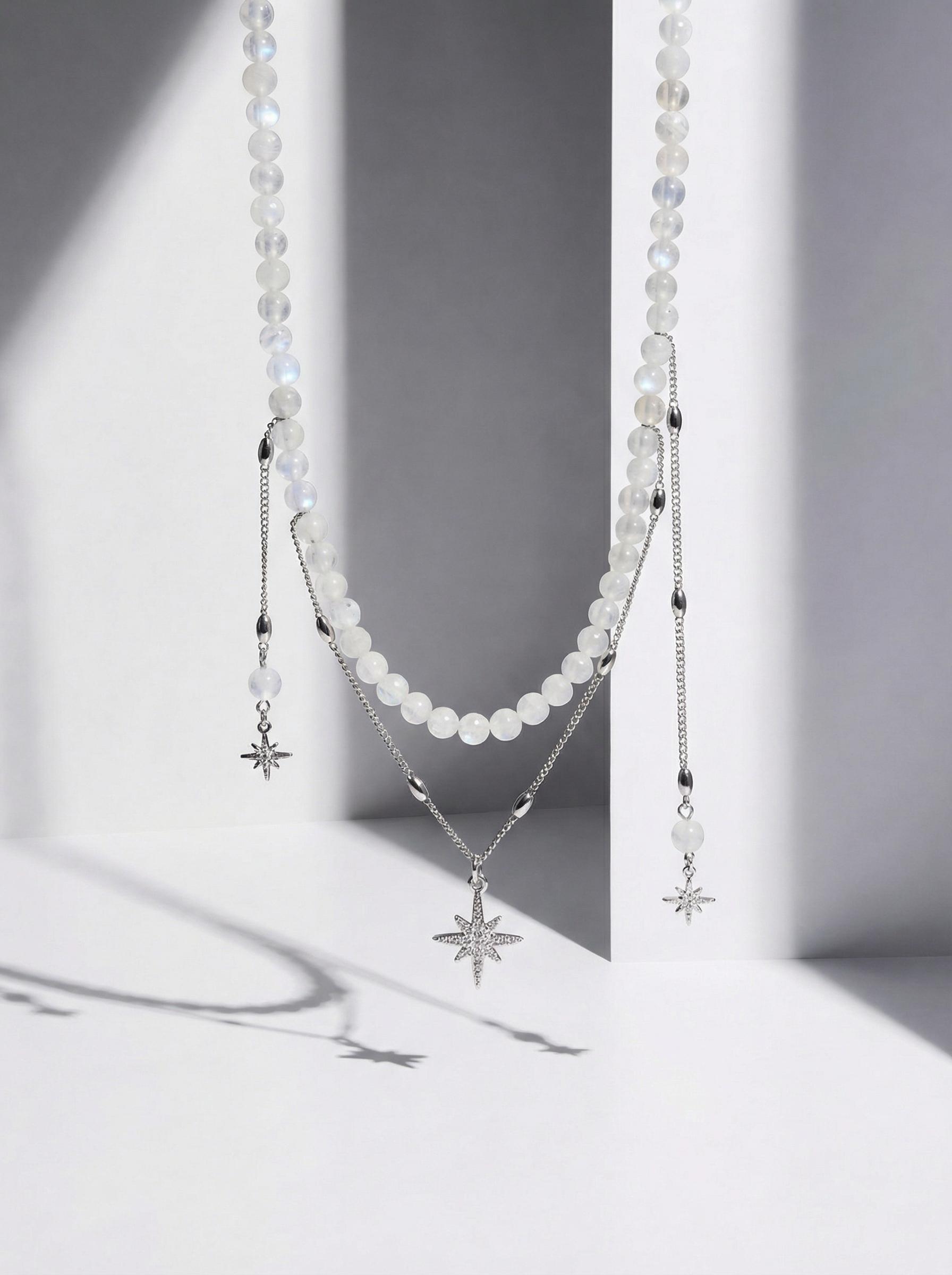Колье «Путеводная звезда» станет вашим личным компасом в мире мечтаний. Его стильный дизайн и символичные акценты вдохновляют на смелые шаги к новым высотам. Материалы: лунный камень, фианиты. Фурнитура из латуни покрыта родием. Длина: 36см + удлинитель 5 см.