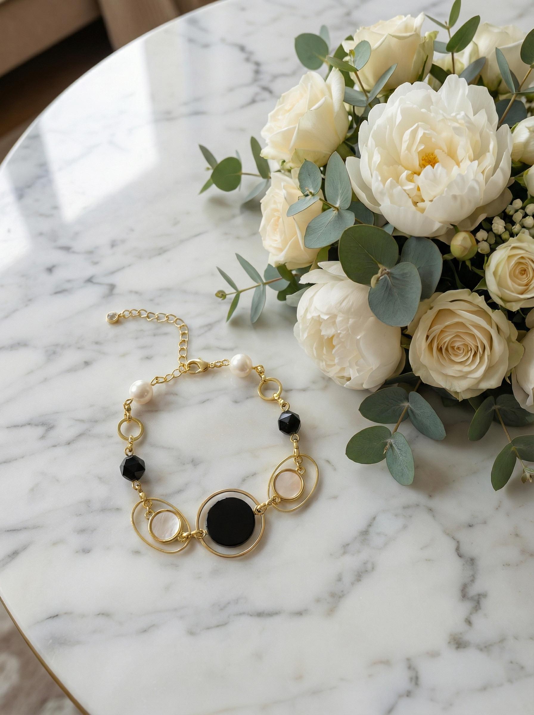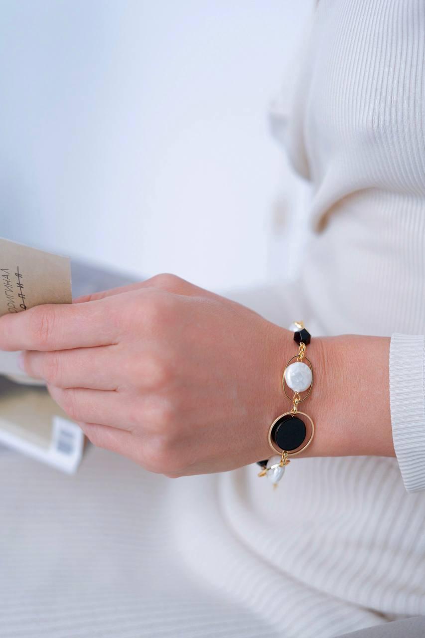 Этот браслет символизирует гармонию и спокойствие. Его сбалансированный дизайн и сочетание противоположных цветов помогают находить внутренний покой, создавая идеальный баланс в жизни. Материалы: натуральный агат, натуральный культивированный жемчуг, перламутр. Фурнитура из латуни покрыта золотом. Длина: 17,5 см + удлинитель 5 см.