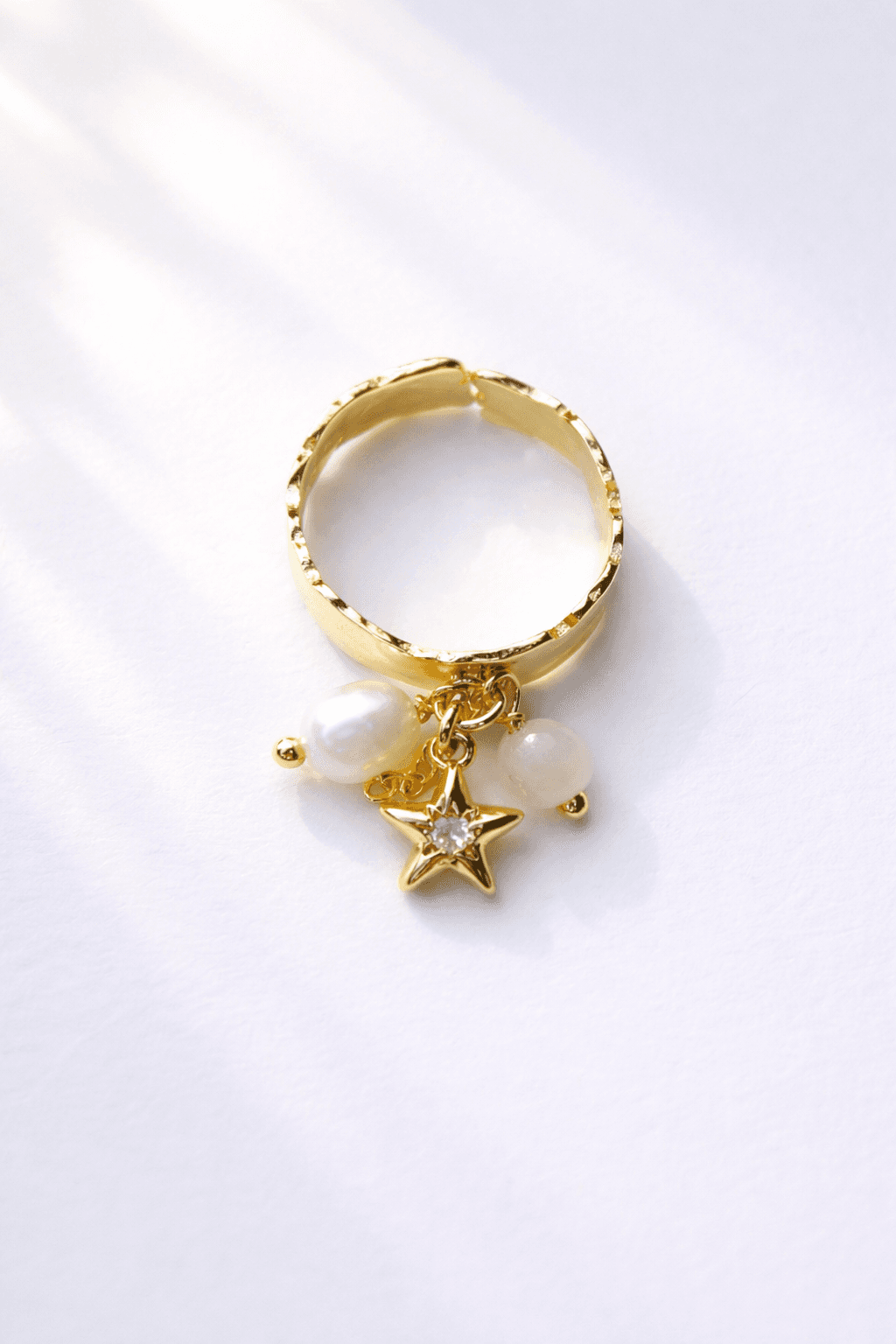 Кольцо «Рождение звезды» символизирует начало нового пути. Его элементы напоминают о том, что каждая мечта начинается с маленькой искры, готовой разгореться в яркий свет. Материалы: лунный камень, натуральный культивированный жемчуг, фианит. Фурнитура из латуни покрыта золотом. Размер: регулируется.