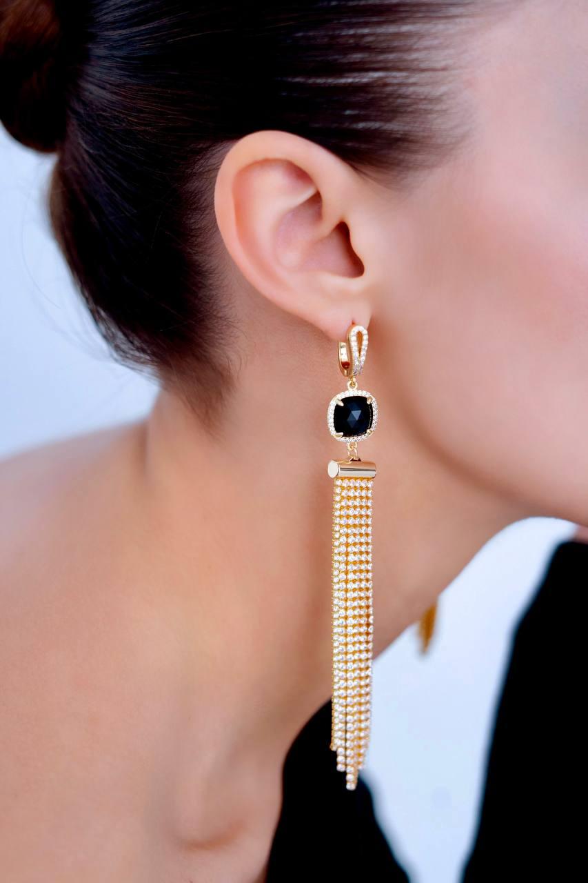 Серьги «Сексуальность» как яркое выражение вашей внутренней силы, обрамляют лицо изысканным блеском. Их смелый дизайн и элегантные линии подчеркивают вашу уверенность и притягательность, создавая ауру загадочности и соблазна. Материалы: фианиты, натуральный обсидиан. Фурнитура из латуни покрыта золотом. Длина: 13 см.