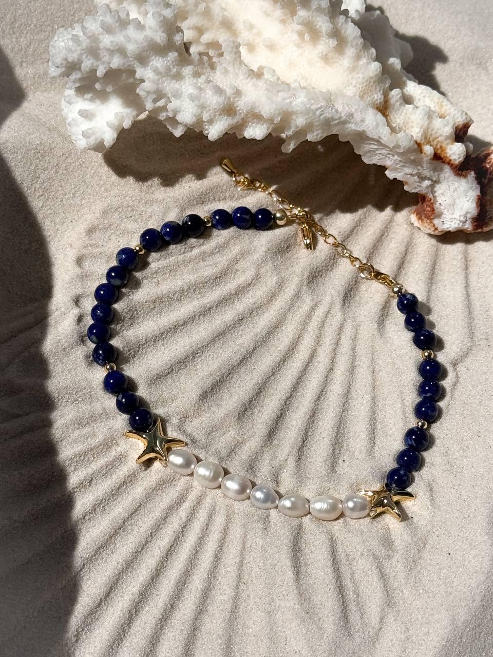 Это украшение переносит вас в безбрежные просторы океана. Оно вдохновляет на новые открытия и наполняет свежестью каждый ваш день. Материалы: натуральный лазурит, натуральный культивированный жемчуг. Фурнитура из латуни покрыта золотом. Длина: 24см + удлинитель 5см.