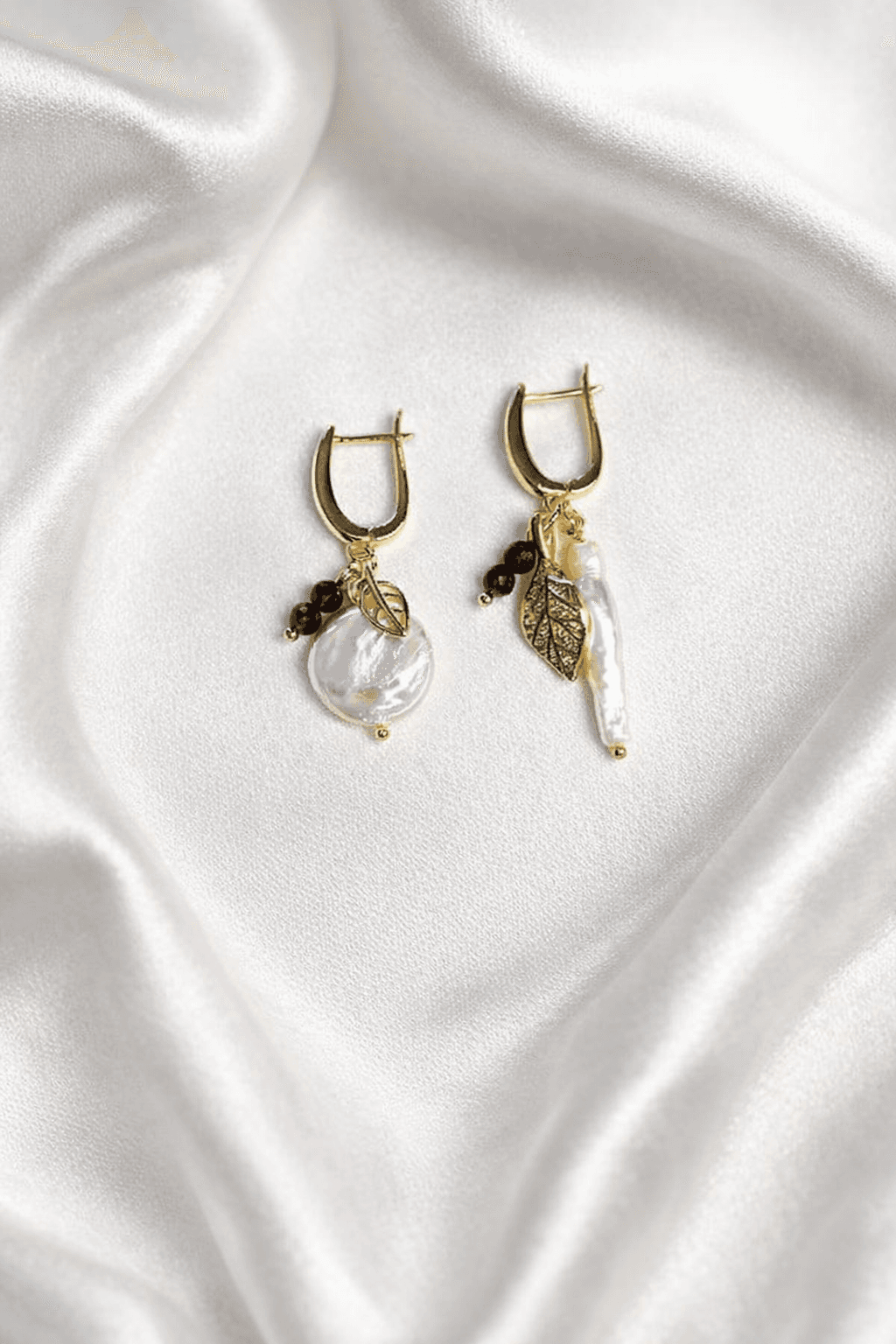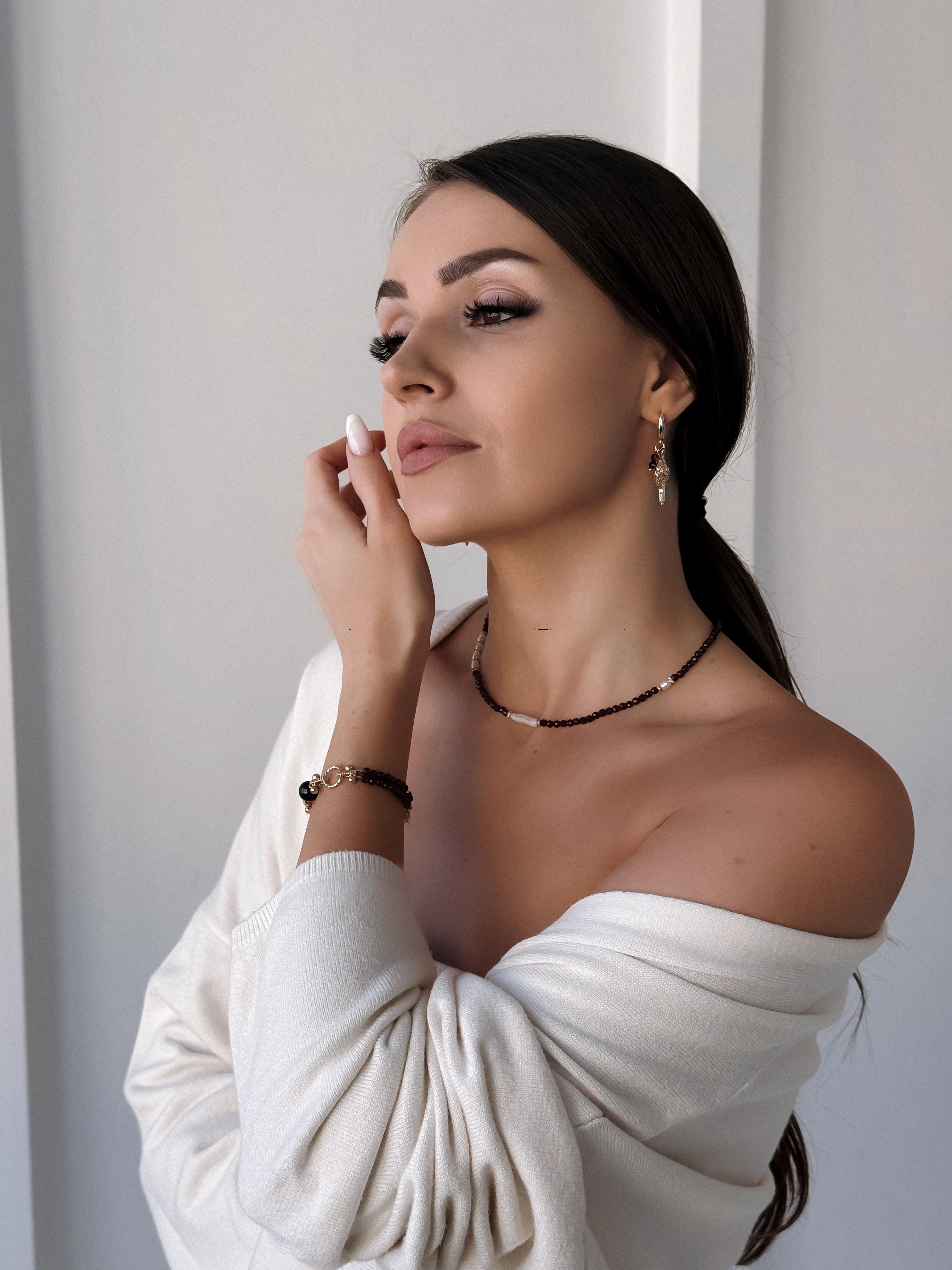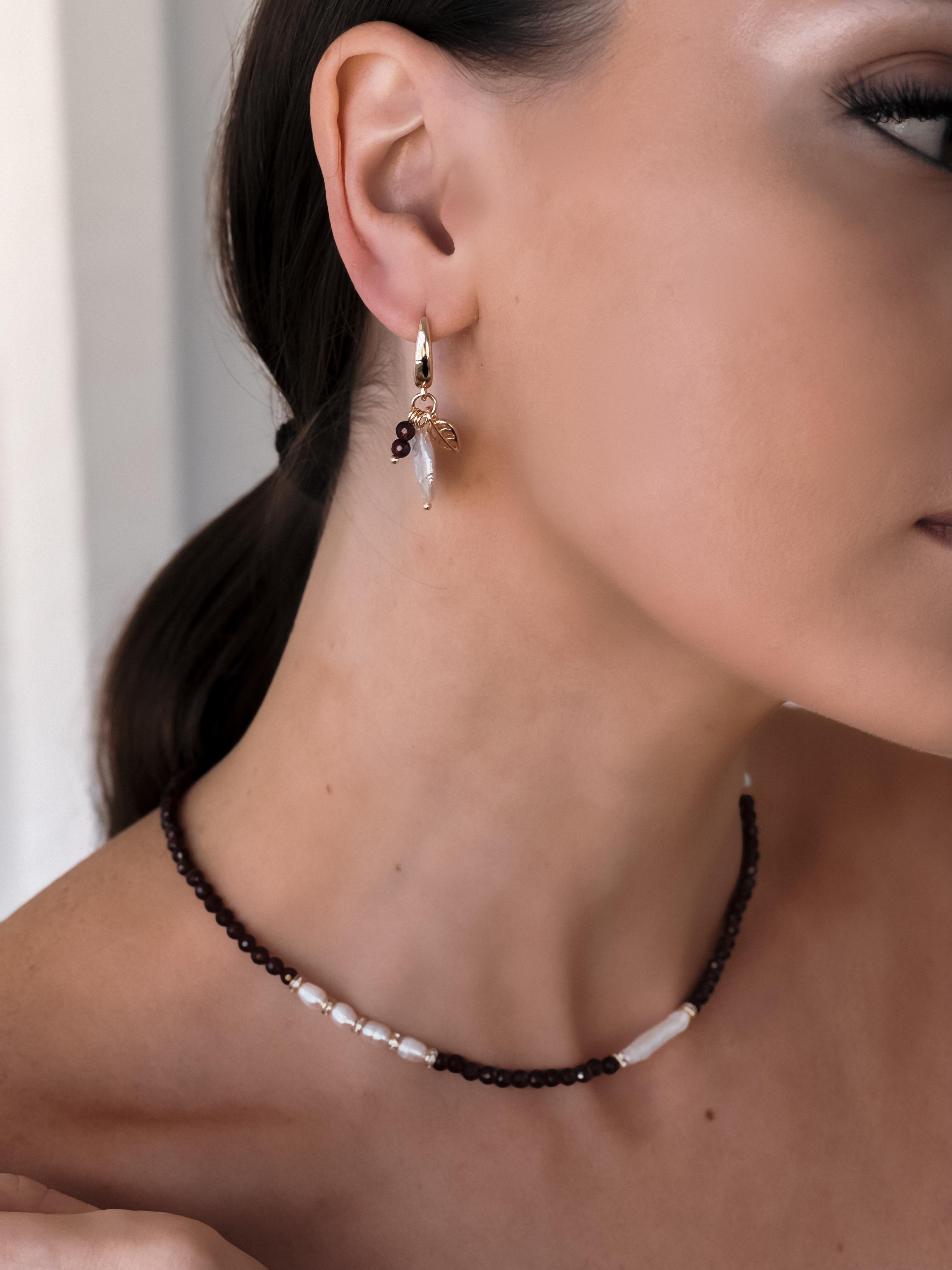 Сочетание природных мотивов и натуральных камней вдохновляет на создание красоты в повседневной жизни. Жемчуг говорит тонком восприятии, а асимметрия напоминает, что красота может проявляться в несовершенствах. Материалы: натуральный гранат, натуральный культивированный жемчуг, фианиты. Фурнитура из латуни покрыта золотом. Длина: 4см и 4,5см.