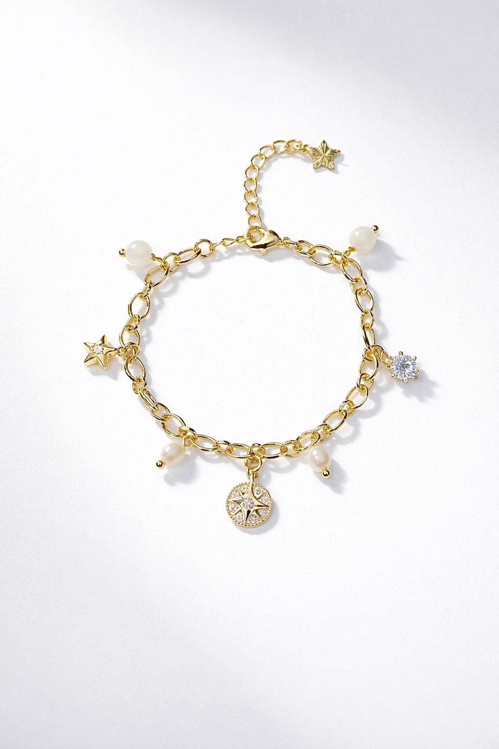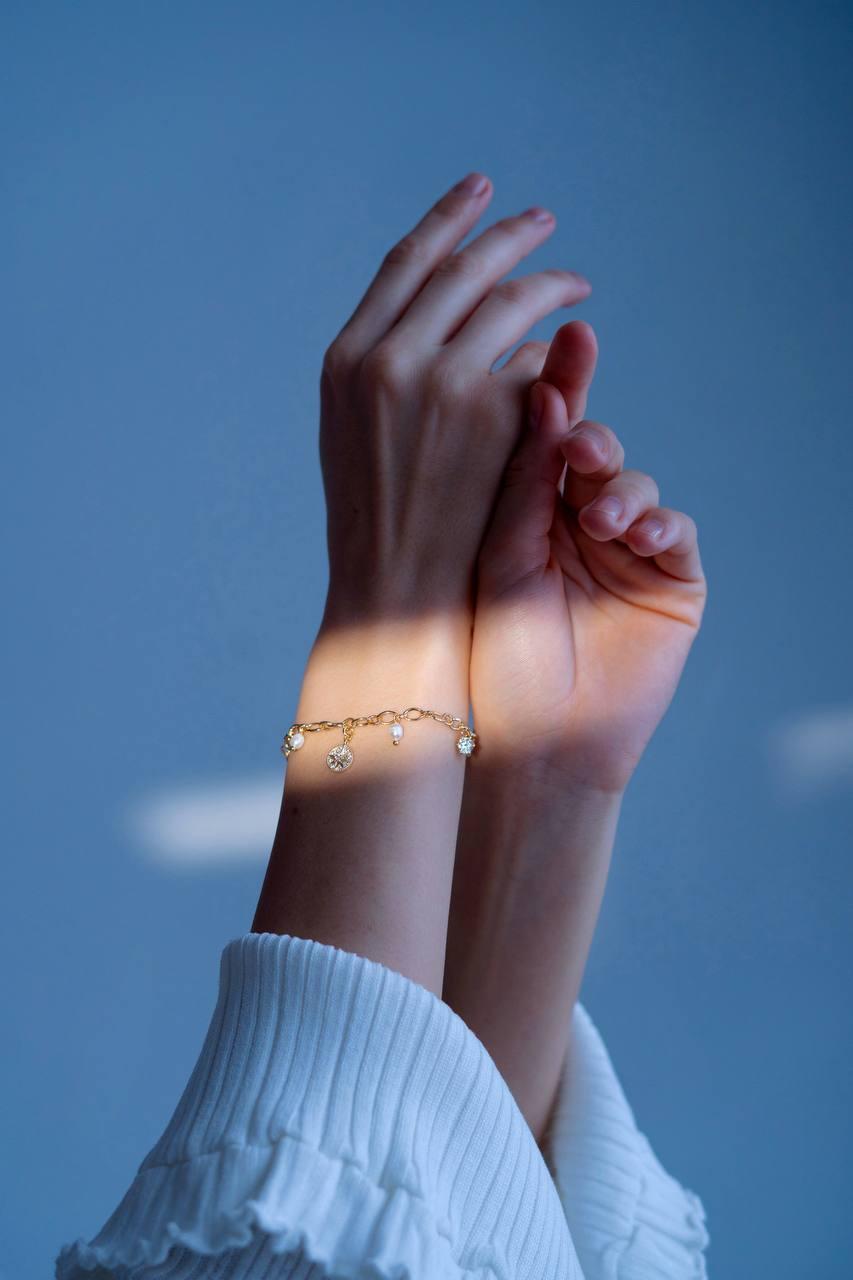 Браслет «Созвездие» — это ваша индивидуальная карта звездного неба. Каждый элемент символизирует важные моменты вашей жизни, объединяя их в единую гармонию. Материалы: лунный камень, натуральный культивированный жемчуг, фианиты. Фурнитура из латуни покрыта золотом. Длина: 16см + удлинитель 5см.