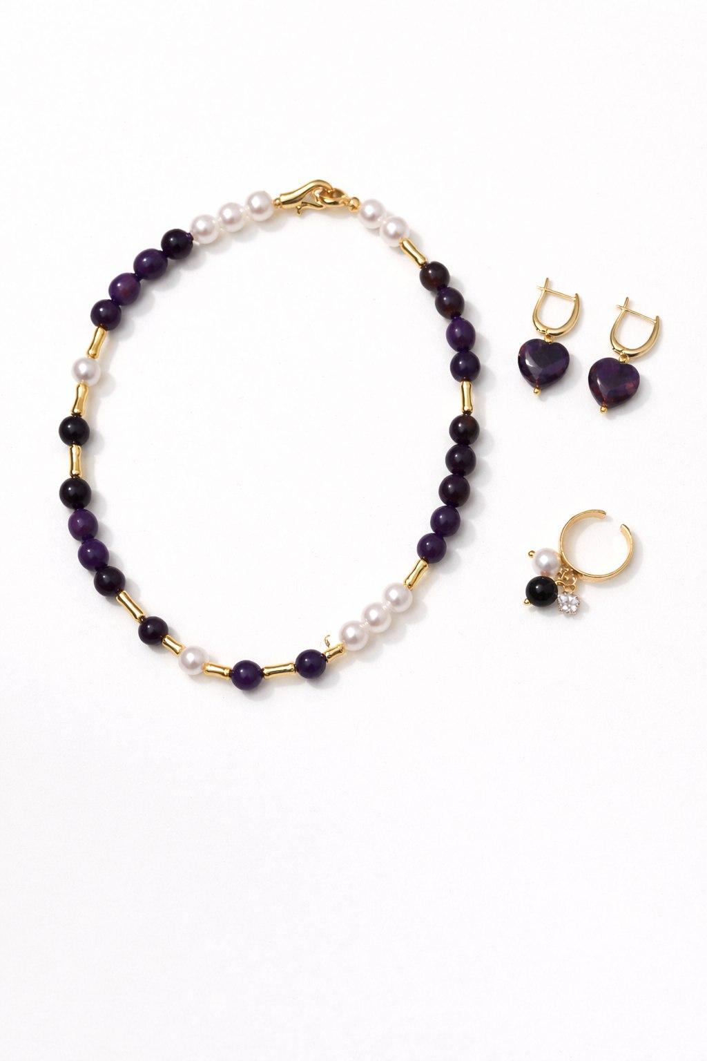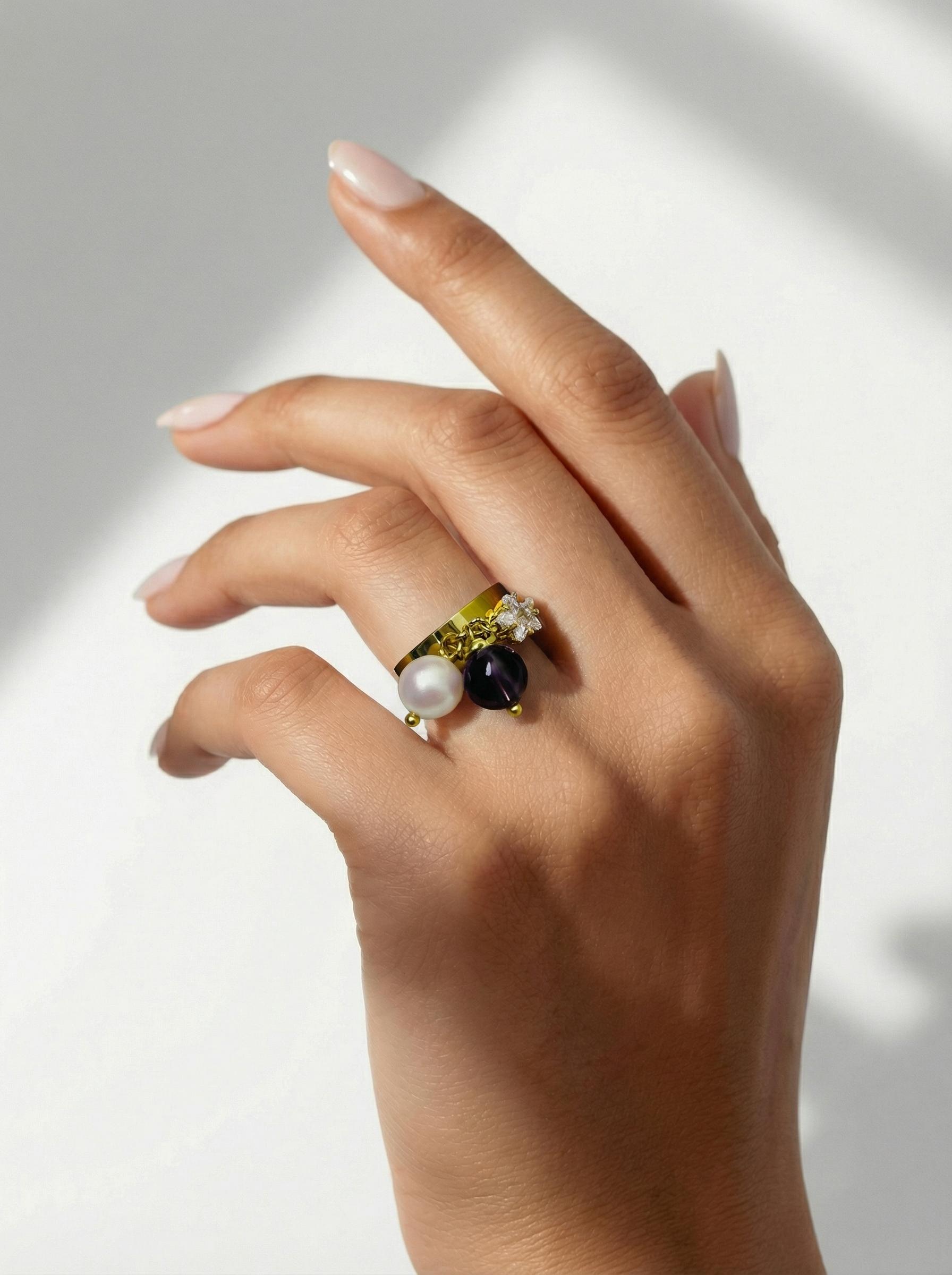 Это кольцо — символ интуиции, которая открывает двери к новым возможностям. Оно напоминает о том, что любой вечер может стать началом чего-то удивительного. Материалы: натуральный аметист, жемчуг Майорка, фианит. Фурнитура из латуни и стали покрыта золотом. Размер регулируется.