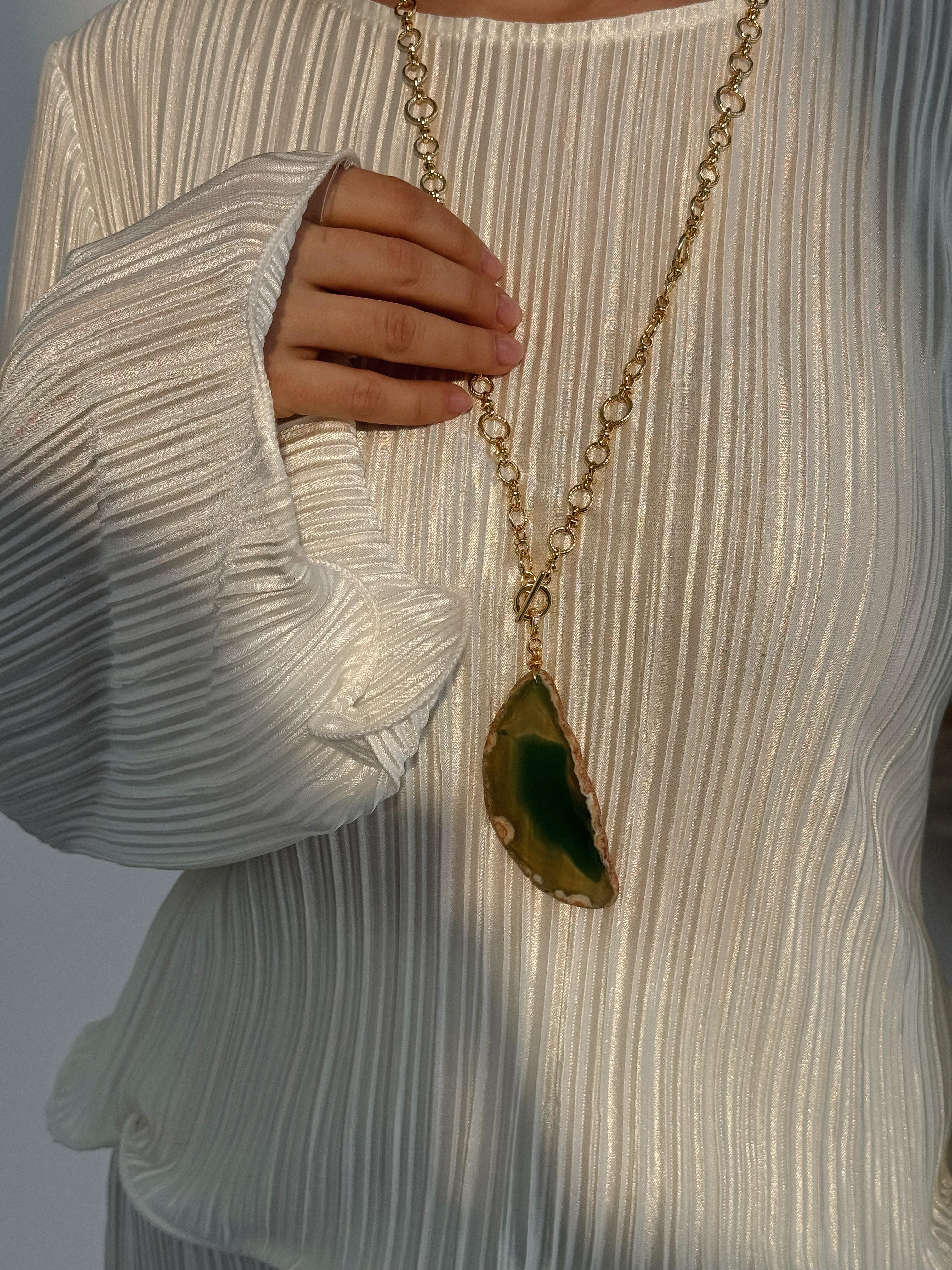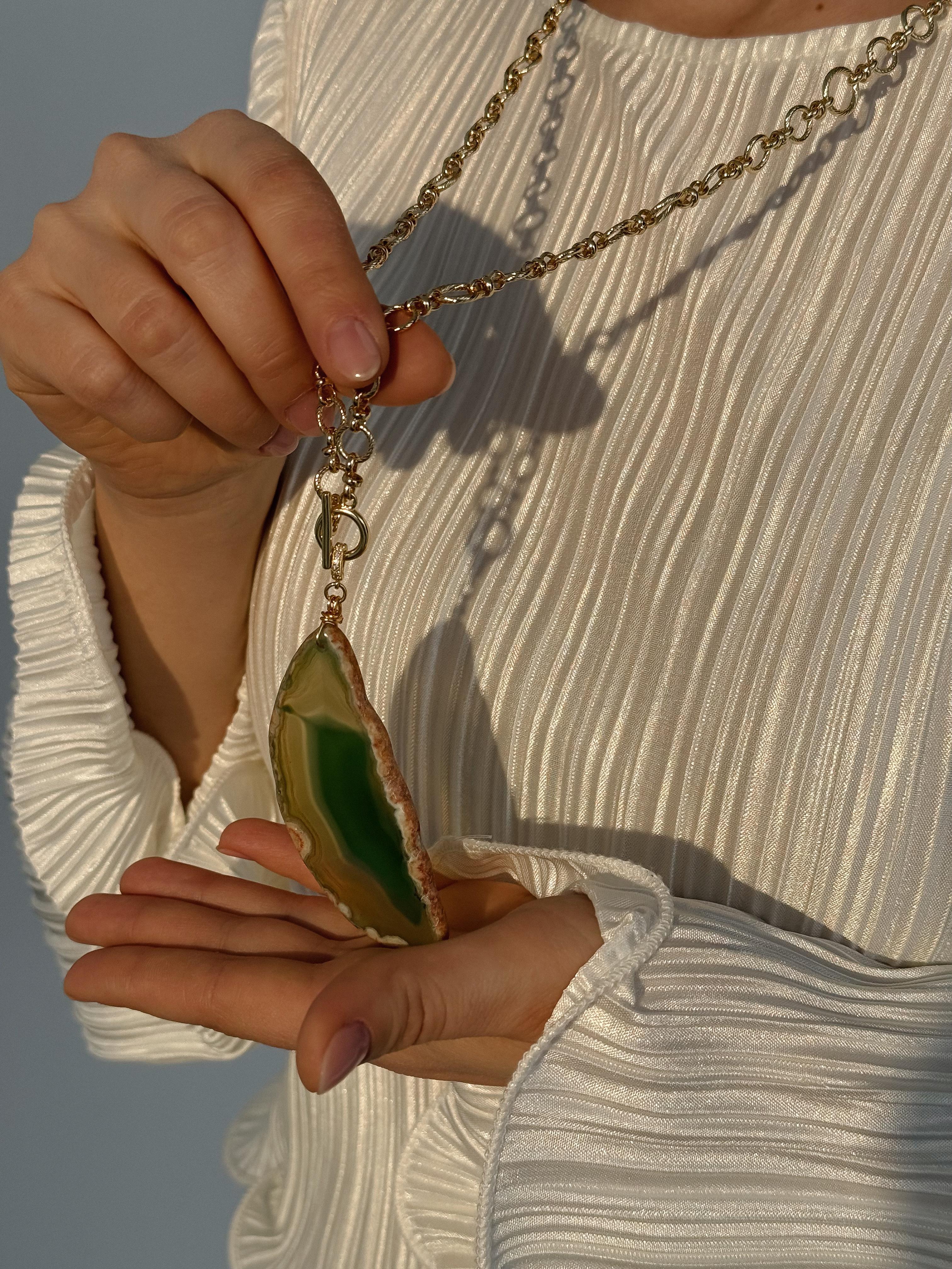 Цепь с крупным срезом агата напоминает свежесть весеннего ветра, который приносит запахи цветущих садов. Подвеска из агата, словно кусочек природы, добавляет яркие акценты в ваш образ и наполняет его энергией. Материалы: натуральный агат, фианиты. Фурнитура из латуни покрыта золотом. Длина цепочки: 78 см. Длина подвески: 10 см.