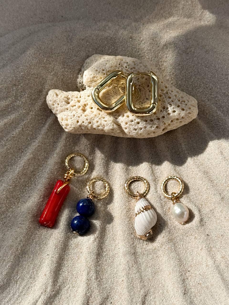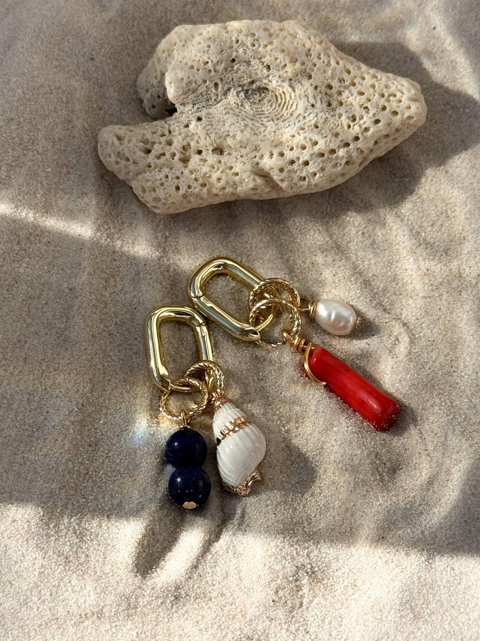 Эти серьги позволяют менять стиль в зависимости от настроения. Они напоминают о том, что ваши таланты могут принимать разные формы. Материалы: натуральный культивированный жемчуг, натуральные лазурит, коралл, ракушка. Фурнитура из латуни покрыта золотом. Длина: 4см.