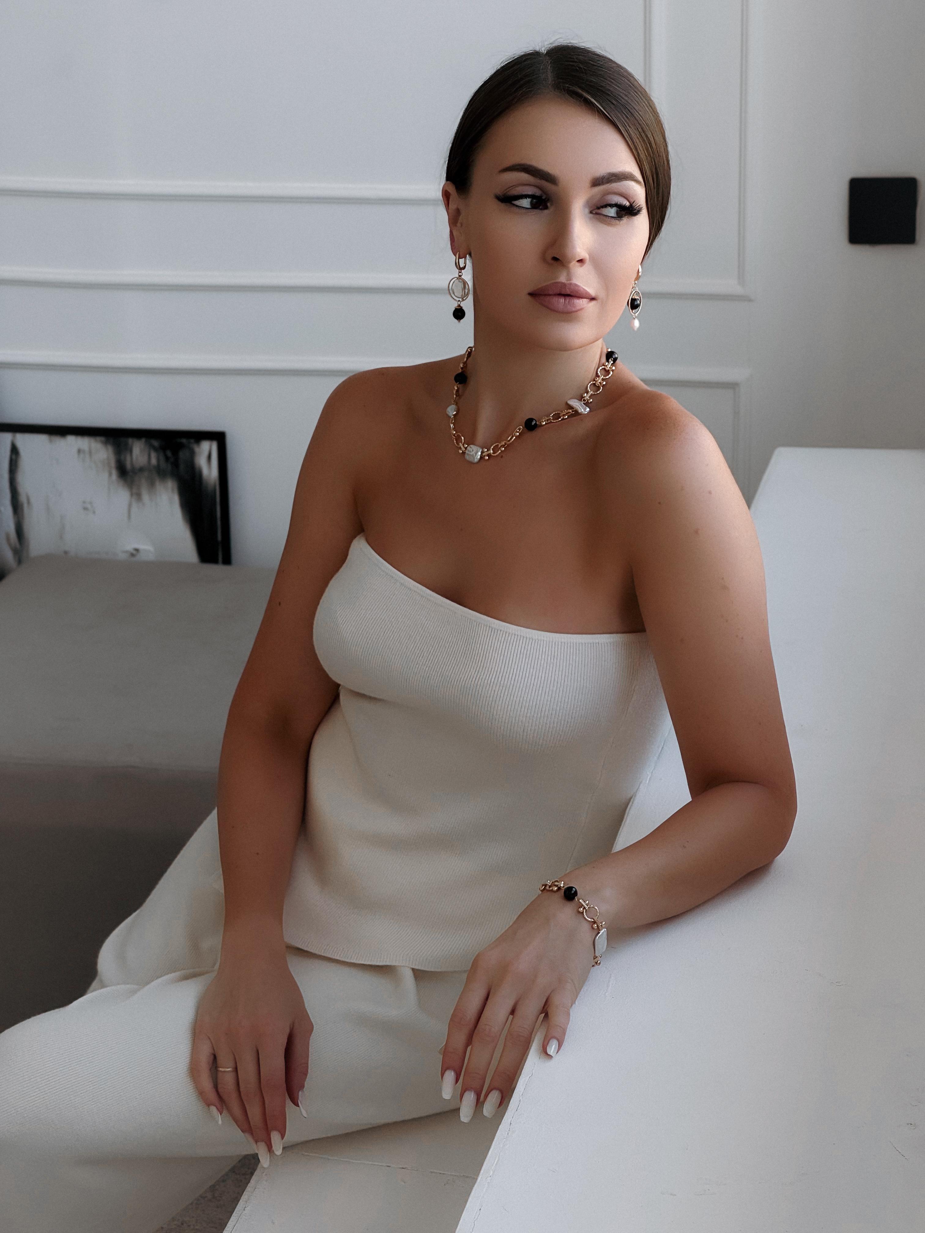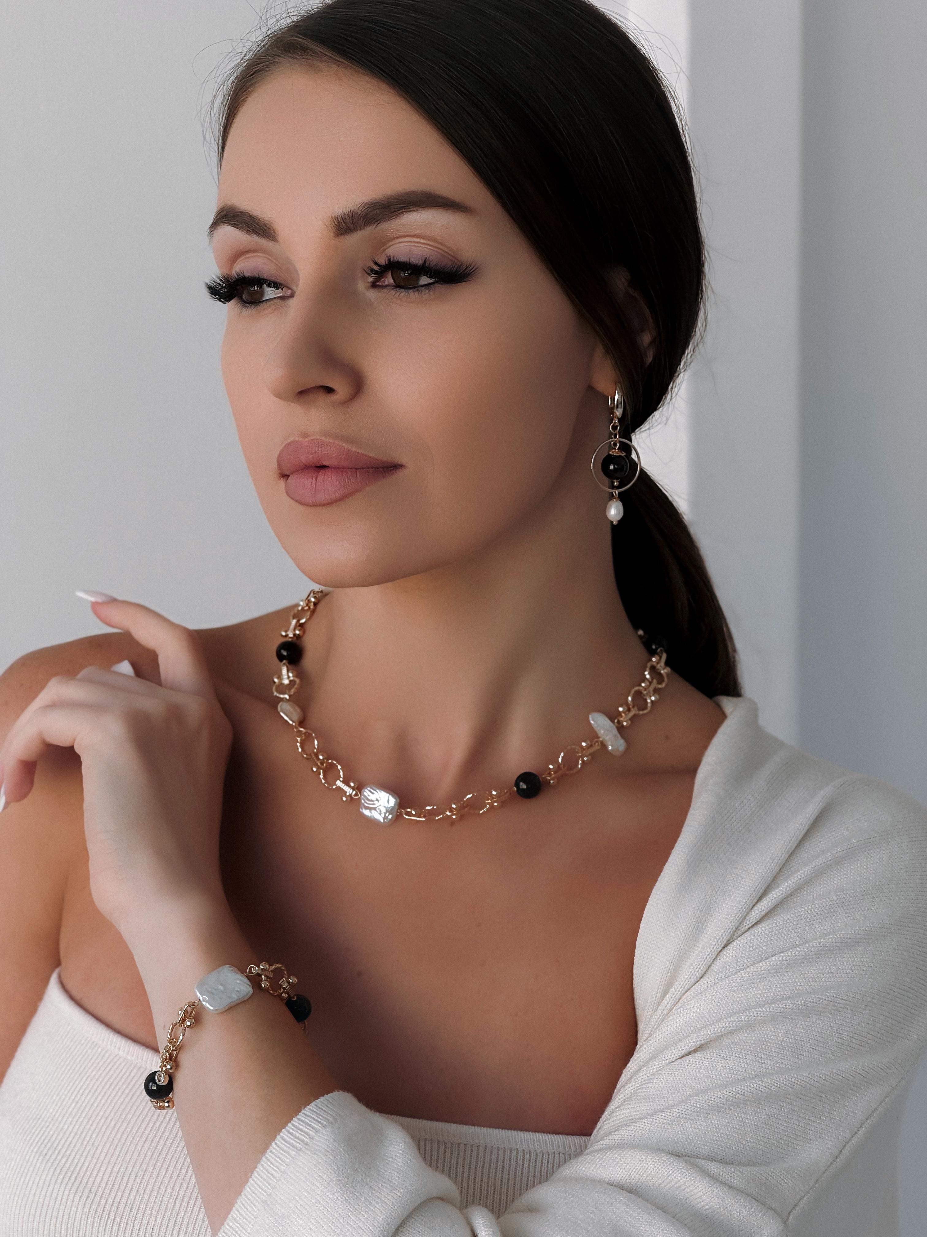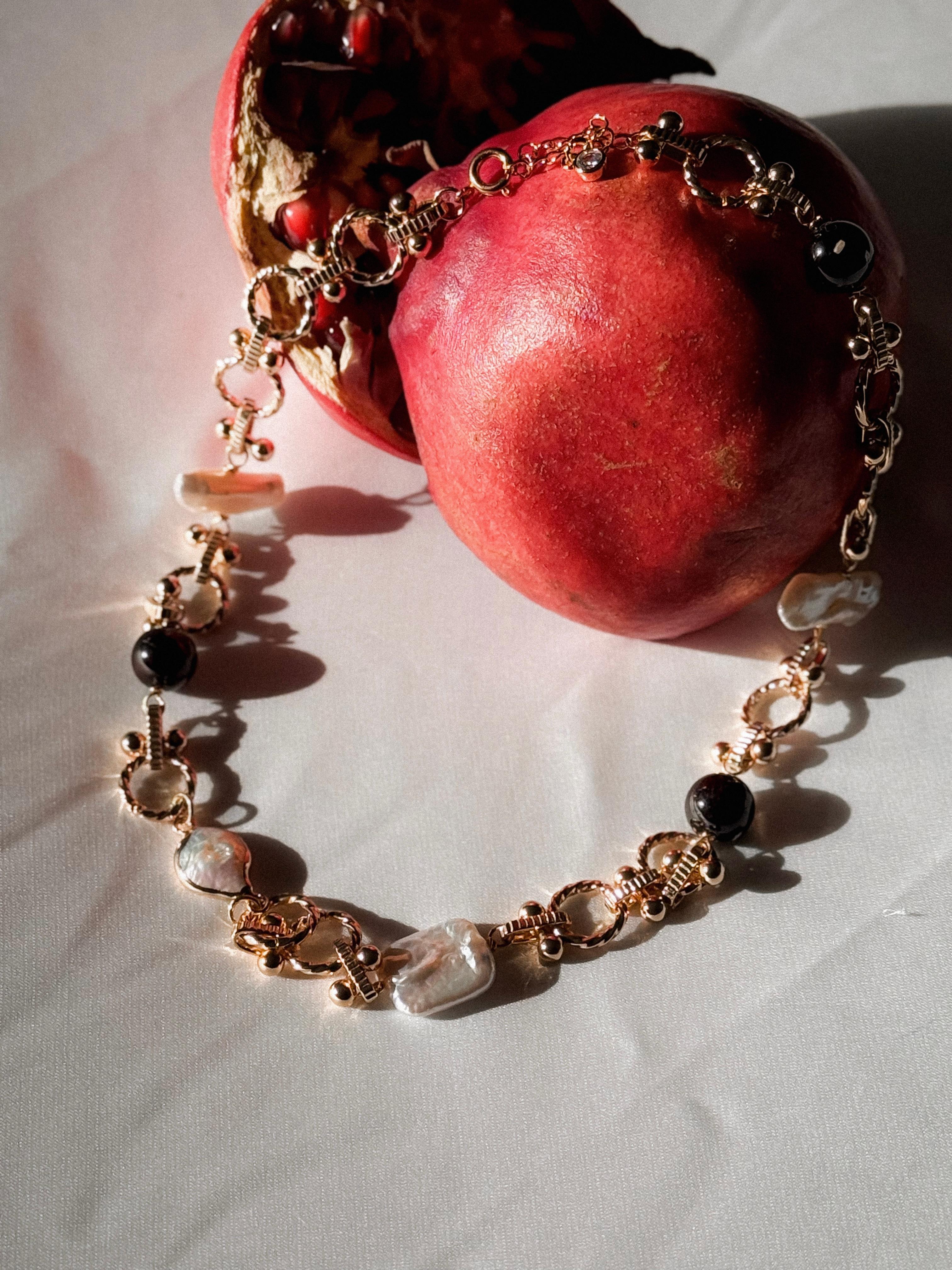 Это колье символизирует внутреннюю силу и уверенность в себе. Жемчуг разной формы олицетворяет многообразие женских чувств, а гранат — решительность, что делает это украшение идеальным аксессуаром для уверенной женщины, которая понимает себя и знает, куда идет. Материалы: натуральный культивированный жемчуг, натуральный гранат. Фурнитура из латуни покрыта золотом/родием. Длина: 41см + удлинитель 5см.