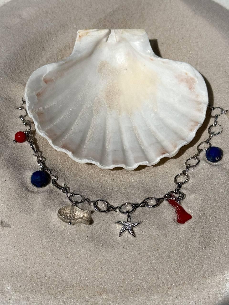Это украшение привлекает внимание игрой света и тени. Оно вдохновляет на творчество и самовыражение в каждом шаге. Материалы: натуральные коралл, лазурит, натуральный культивированный жемчуг, фианиты, стекло. Фурнитура из латуни покрыта родием. Длина: 22,5 см.