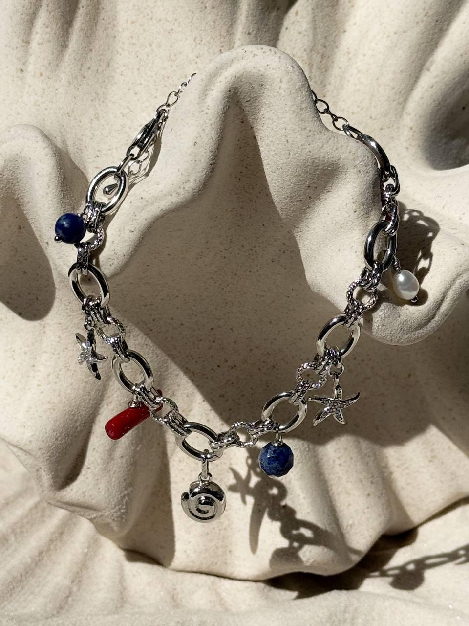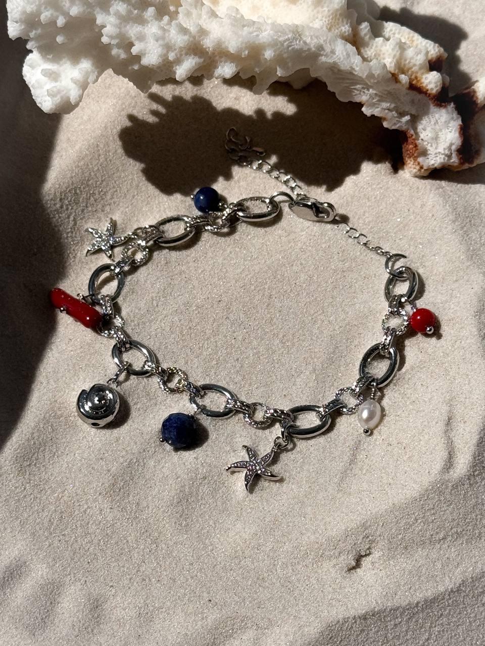 Этот браслет напоминает вихрь чувств и настроений. Он отражает вашу многогранность и желание делиться своими внутренними сокровищами с миром. Материалы: натуральный культивированный жемчуг, натуральные коралл и лазурит, фианиты. Фурнитура из латуни покрыта родием. Длина: 19см + удлинитель 5см.