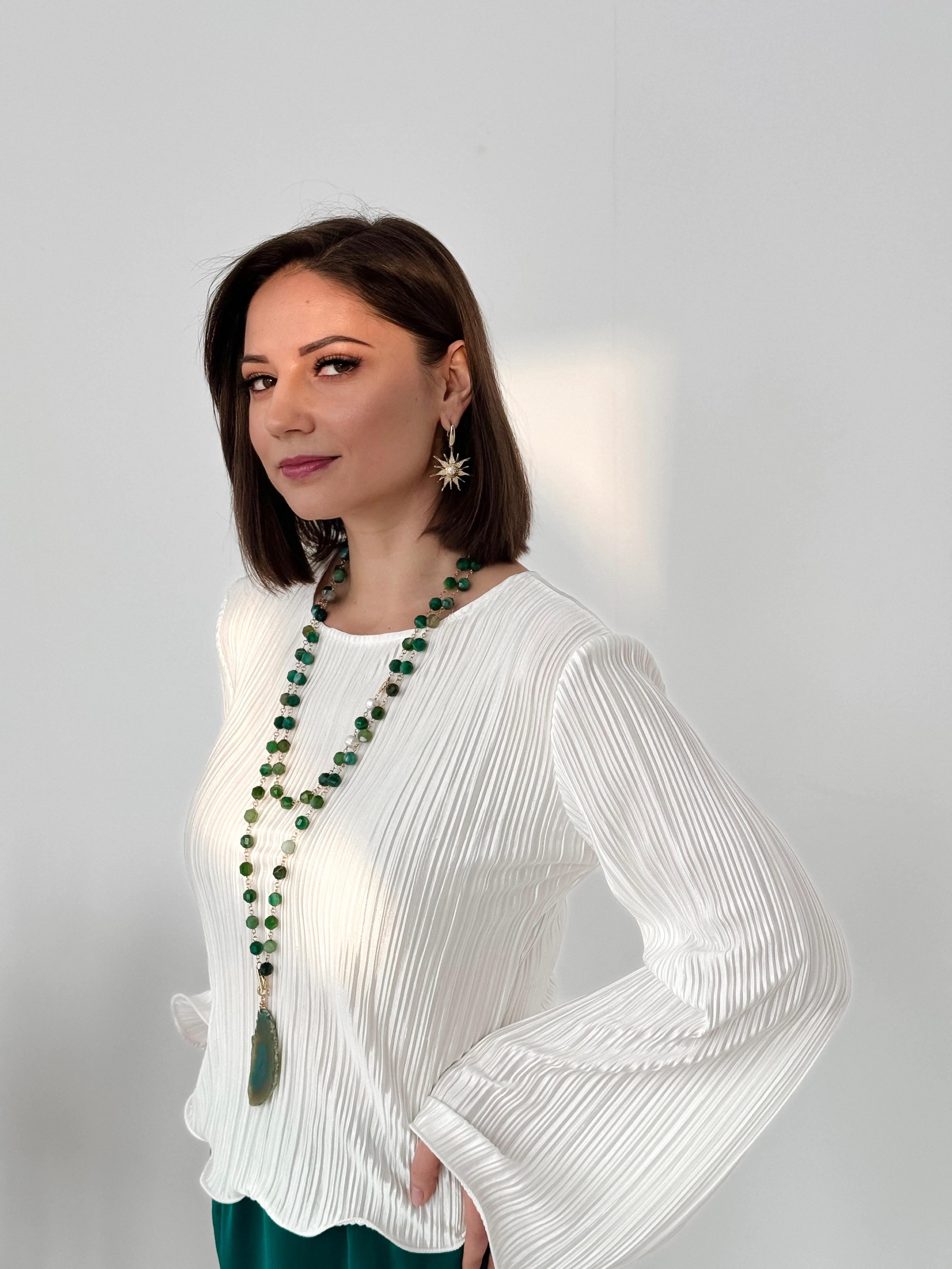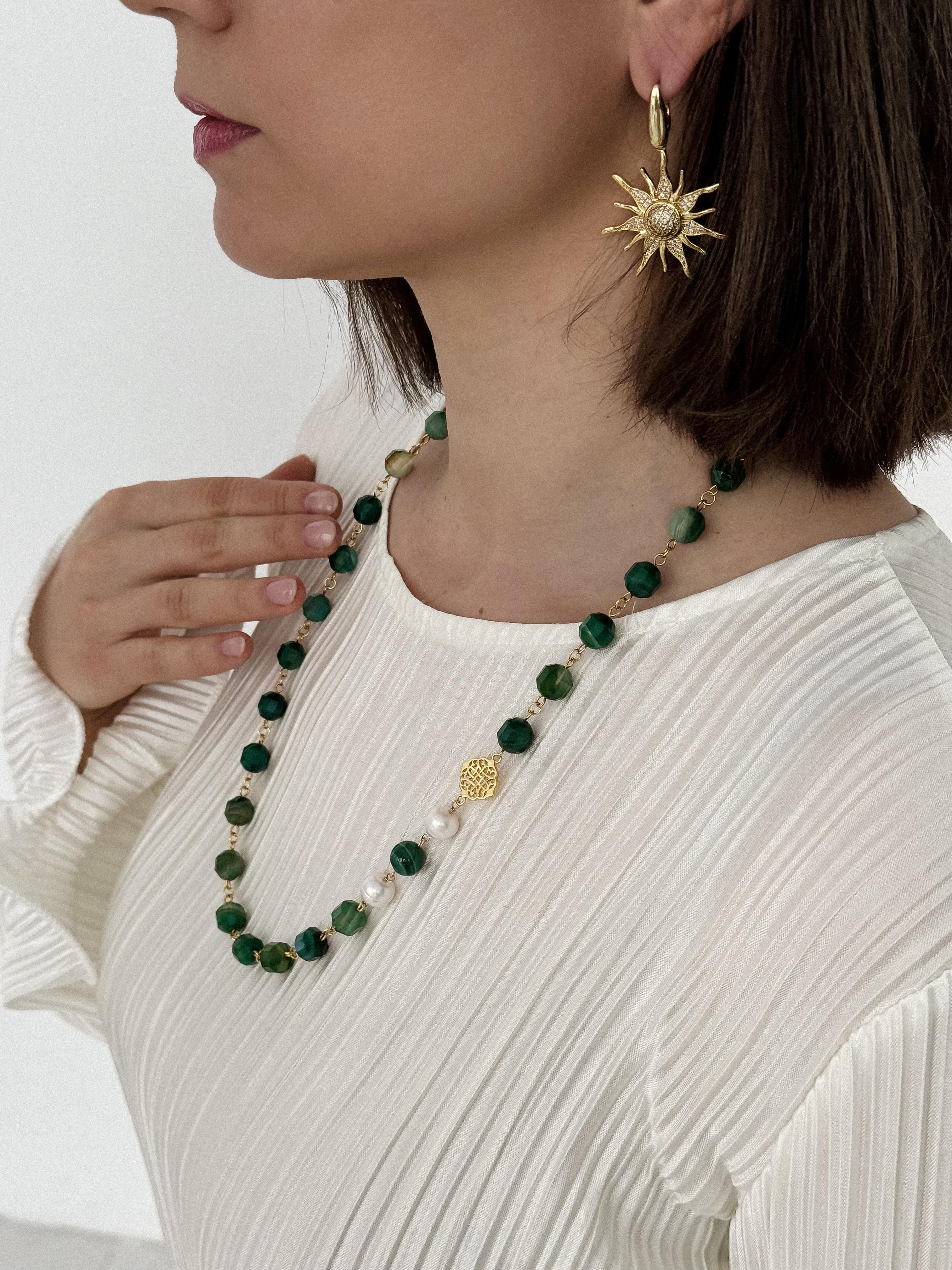 Бусы из агата и пары жемчужин напоминают о весенней листве и уходящем снеге. Их дизайн окутает вас атмосферой свежести и идеально подойдет для весенних прогулок. Материалы: натуральный агат, натуральный культивированный жемчуг. Фурнитура из латуни покрыта золотом. Длина: 67 см.